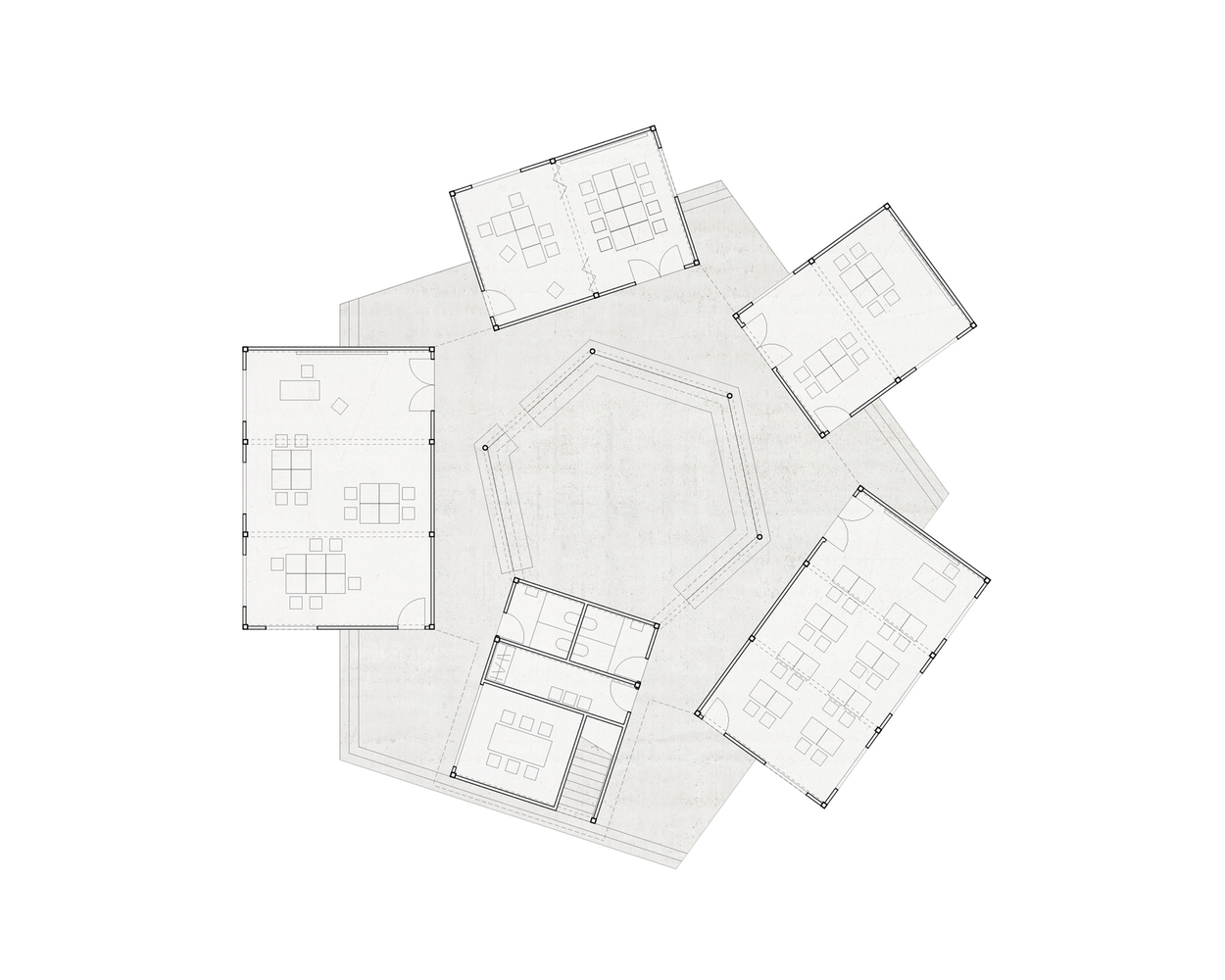 Around a central space, designed as a public theatre, a ring of five houses was planned to accommodate the different functions.