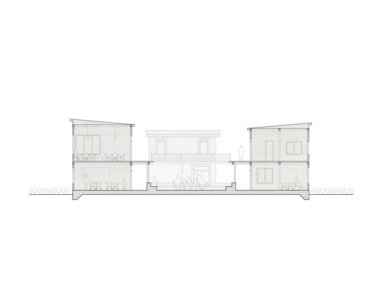 On the ground floor are organized the school functions, the youth center, the training institute, and the open-air theatre, while the first floor accommodates the volunteer residence, the canteen, and the large terrace.