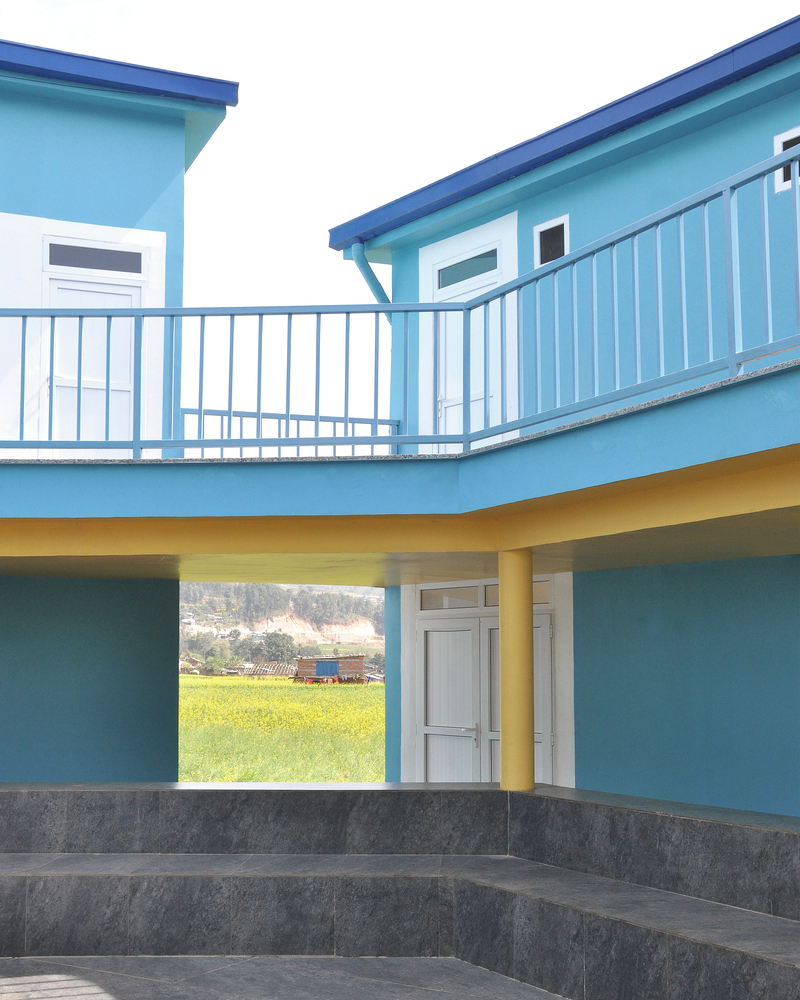 Outside, the houses with their sky-blue color radiate far beyond the village structure, while in contrast, the more intimate and protected central space provides a theatre and meeting place for the entire community.