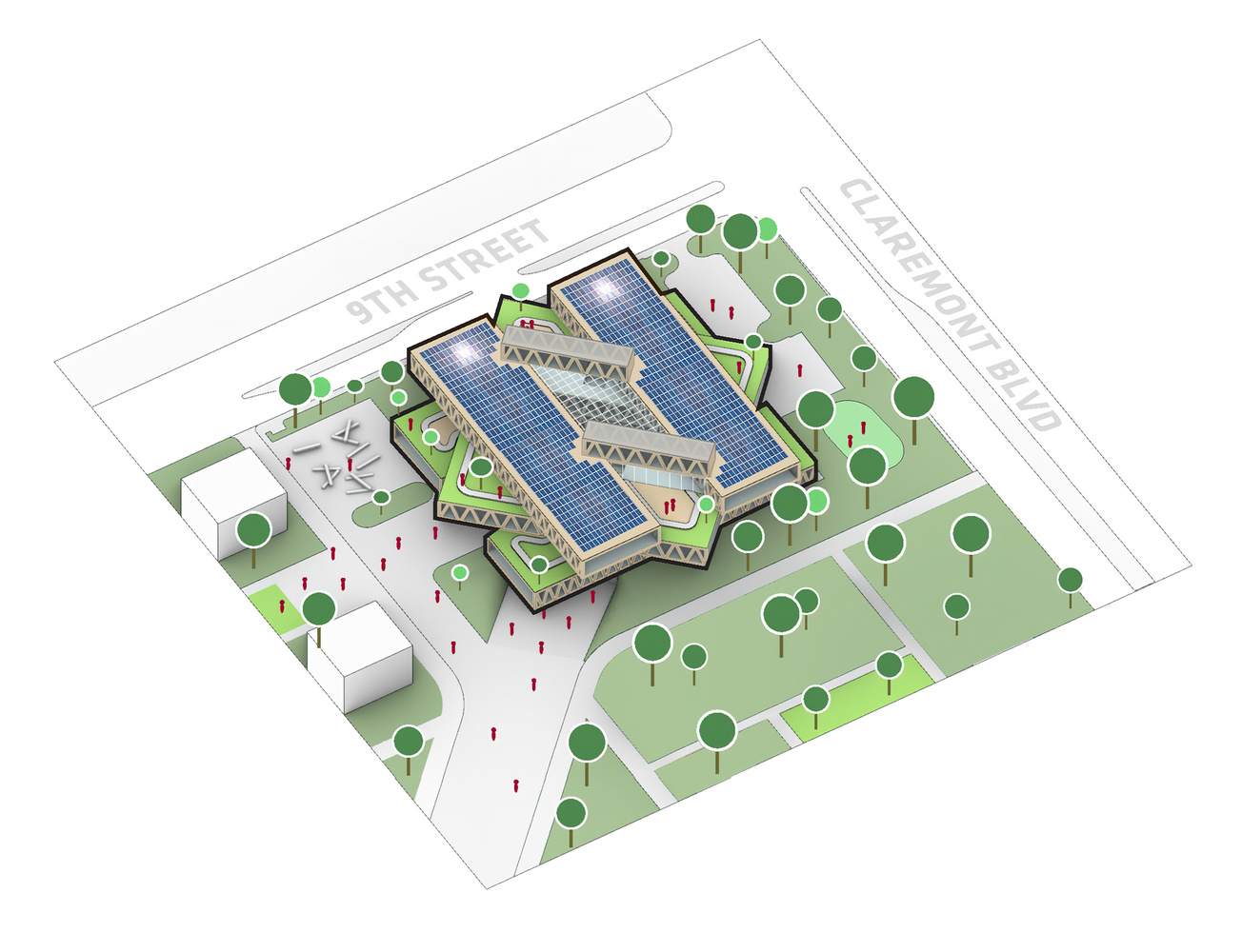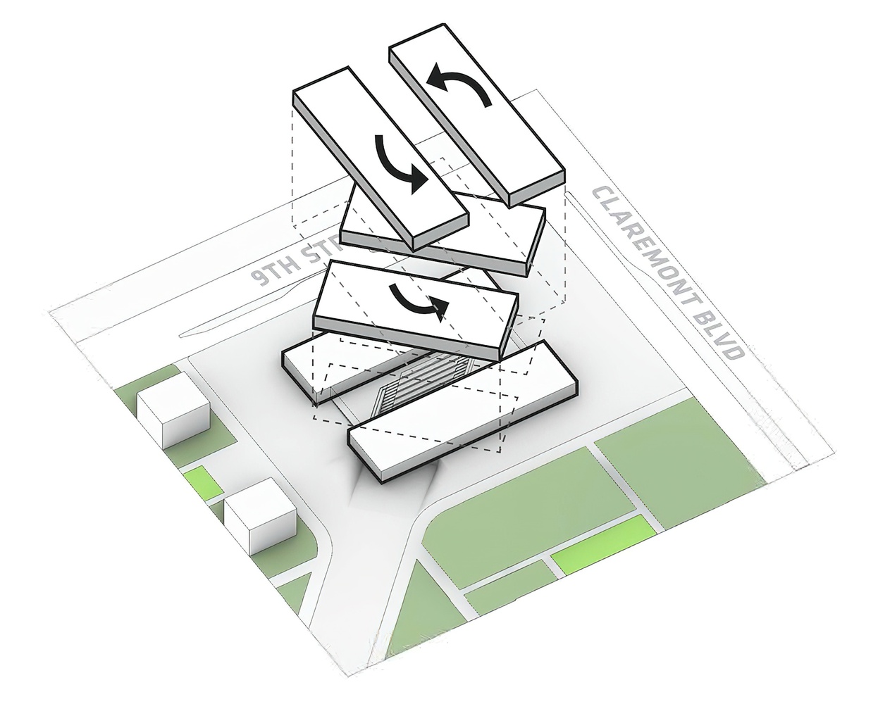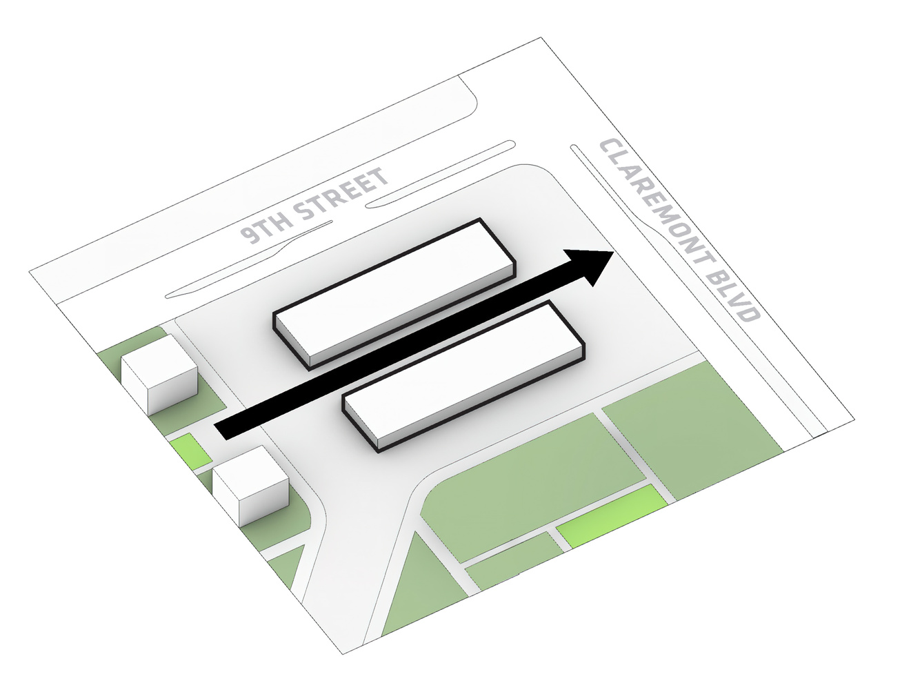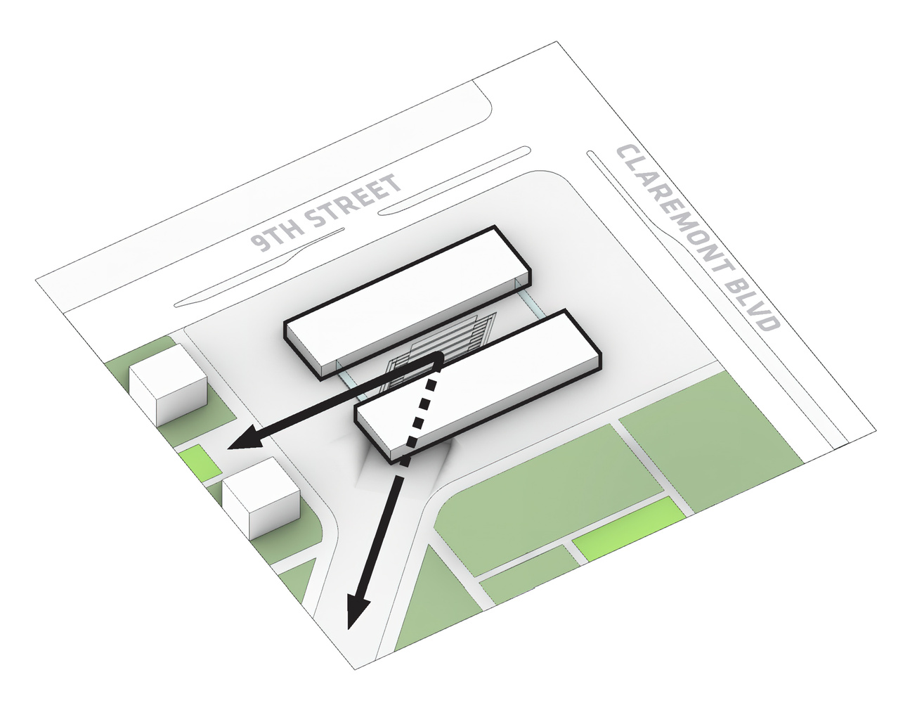 We imagined the Sciences Center as a series of parallel building volumes side by side, with a public space in between, that are rotated in all the same directions as the mall.