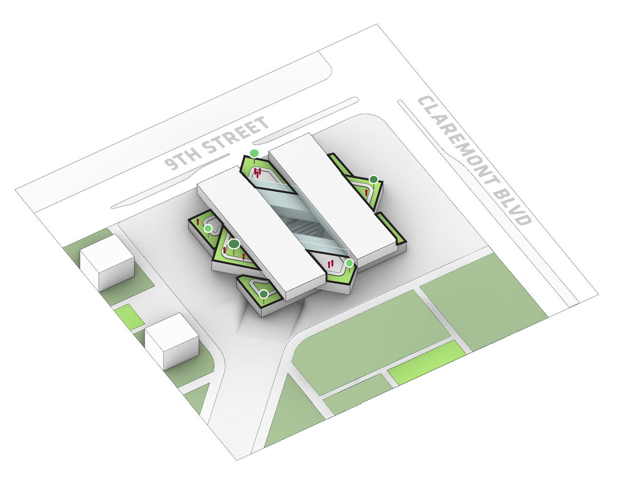 Eight outdoor rooftop terraces located on the corner perimeters of each 'bar' offer sweeping 360-degree views of the mountains to the north, the campus to the west, and the sports bowl to the east.