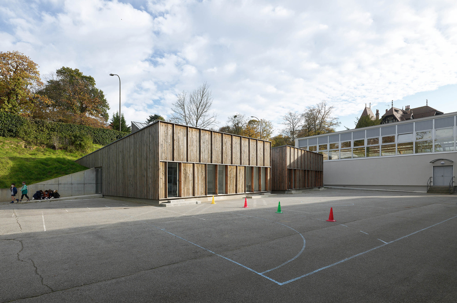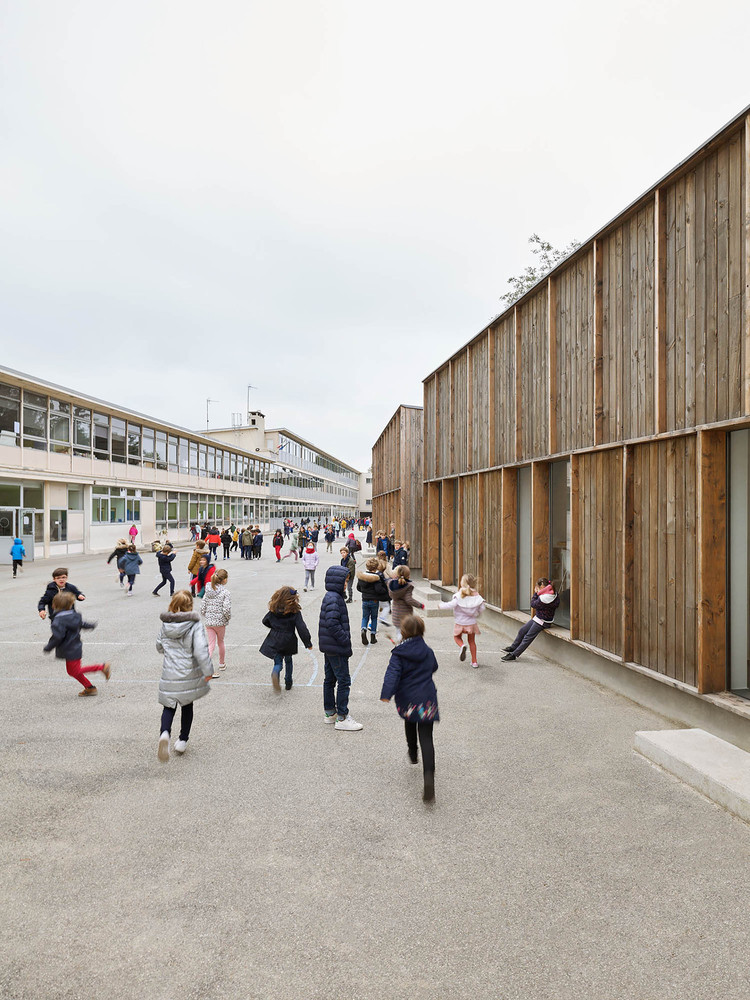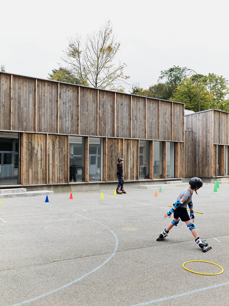 The new recreation center integrates the site of the Morel de Vindé school group and uses part of the recreational area of the schoolyard.