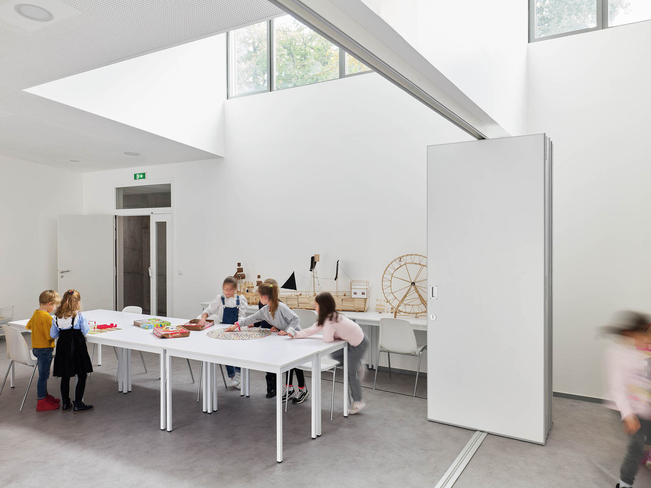 The activity rooms are designed as modular spaces largely open to the playground. Thanks to the installation of a removable acoustic partition, two of them can be joined together to transform into a large room.