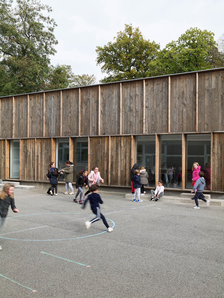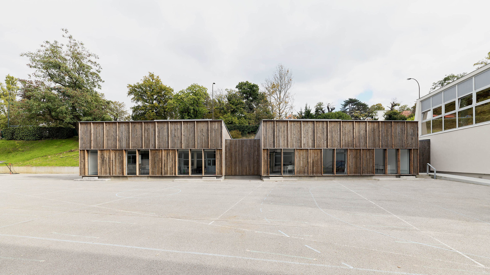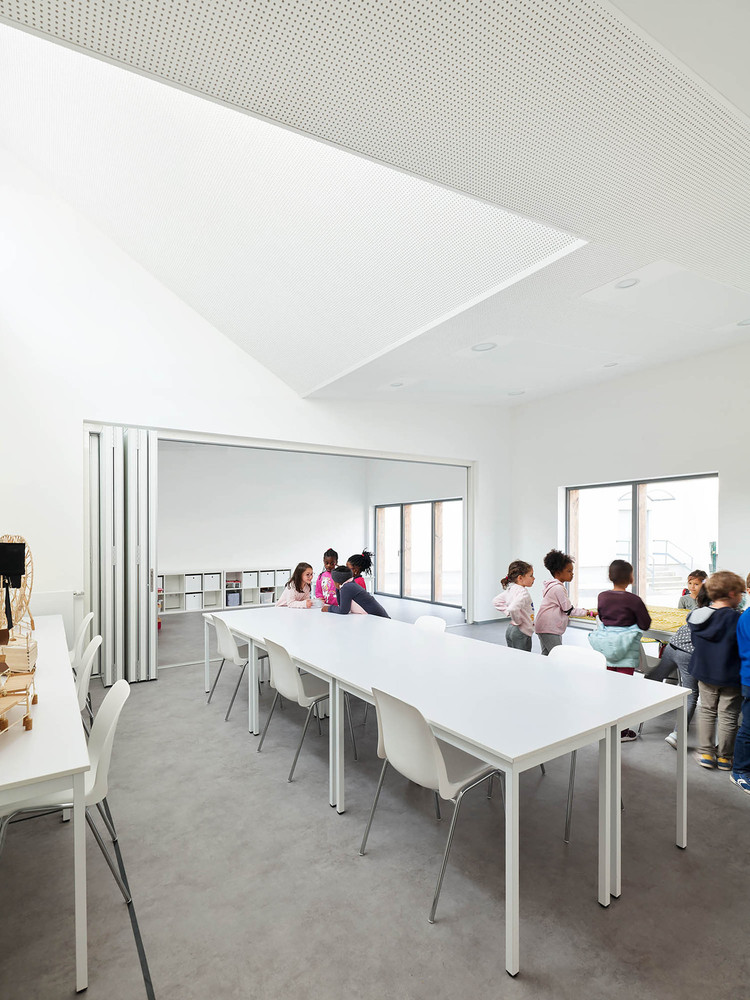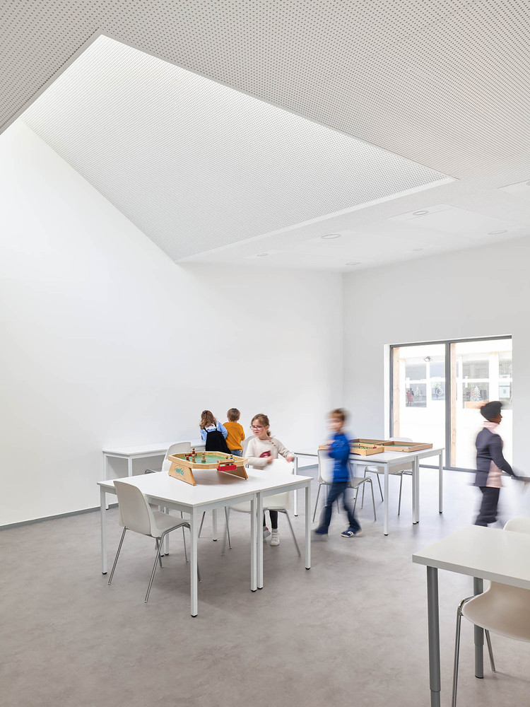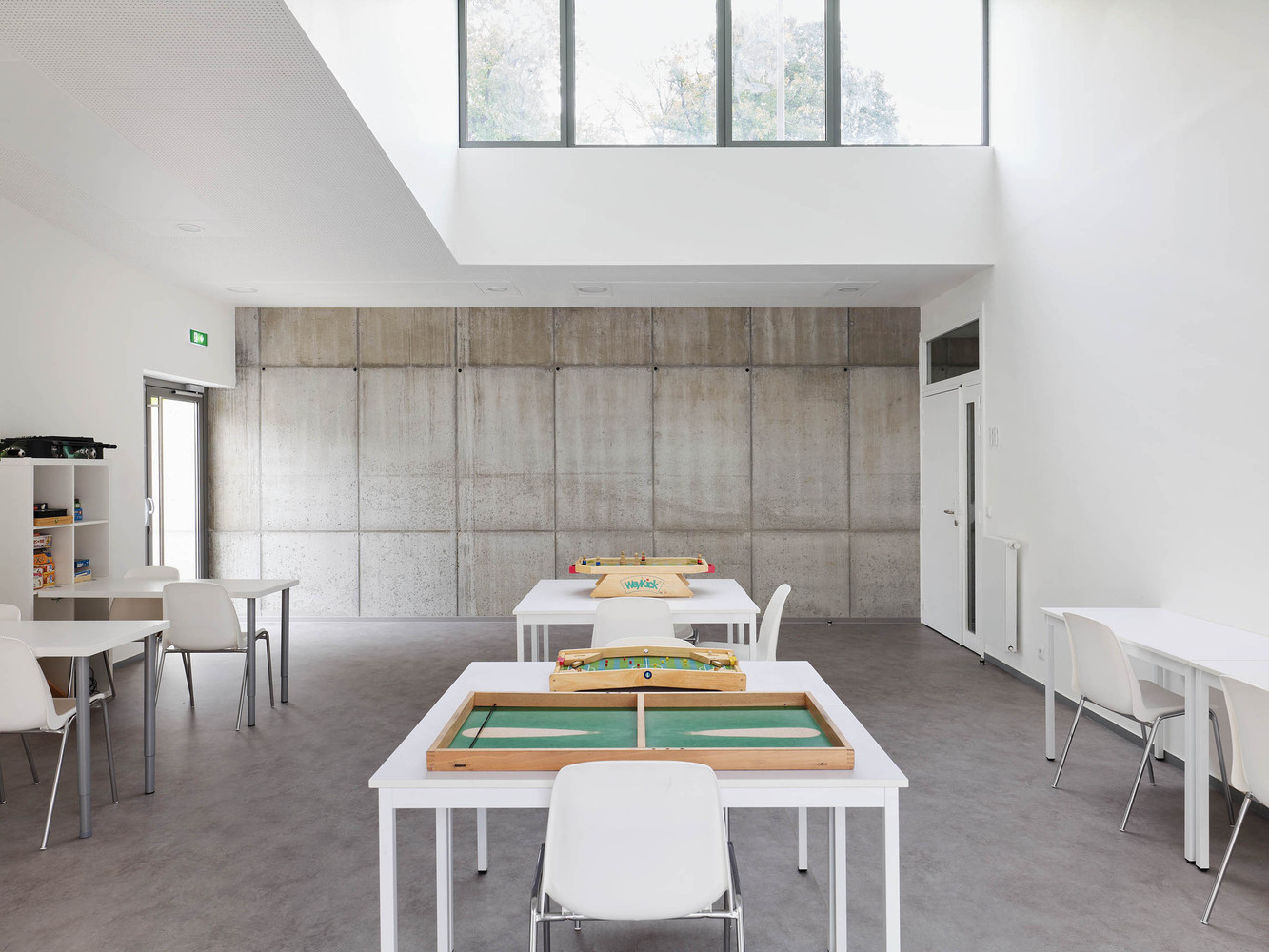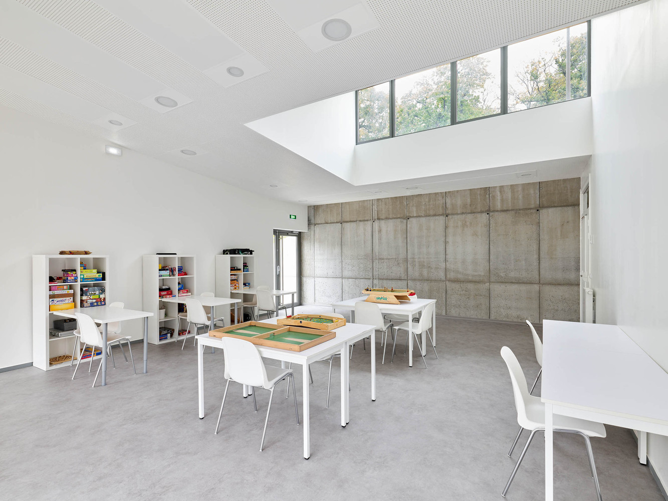The new extracurricular equipment has a double East-West orientation. The activity spaces open to the west on the courtyard. To the east, roof sheds offer views towards the planted embankment and the sky.