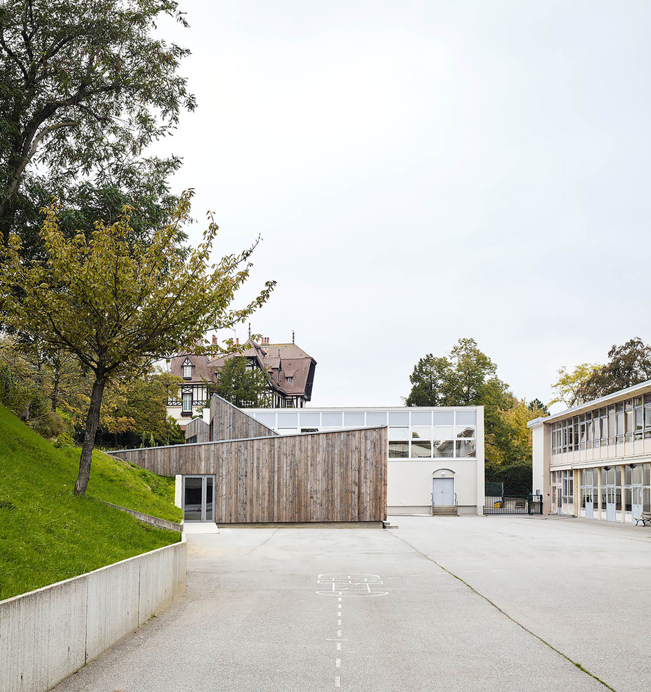 The embankment no longer only represents a limit between the schoolyard and the street, it forms part of the overall composition of the school group.