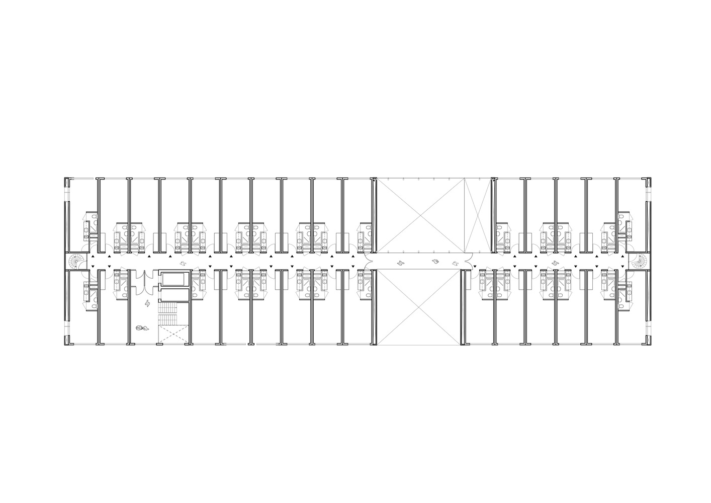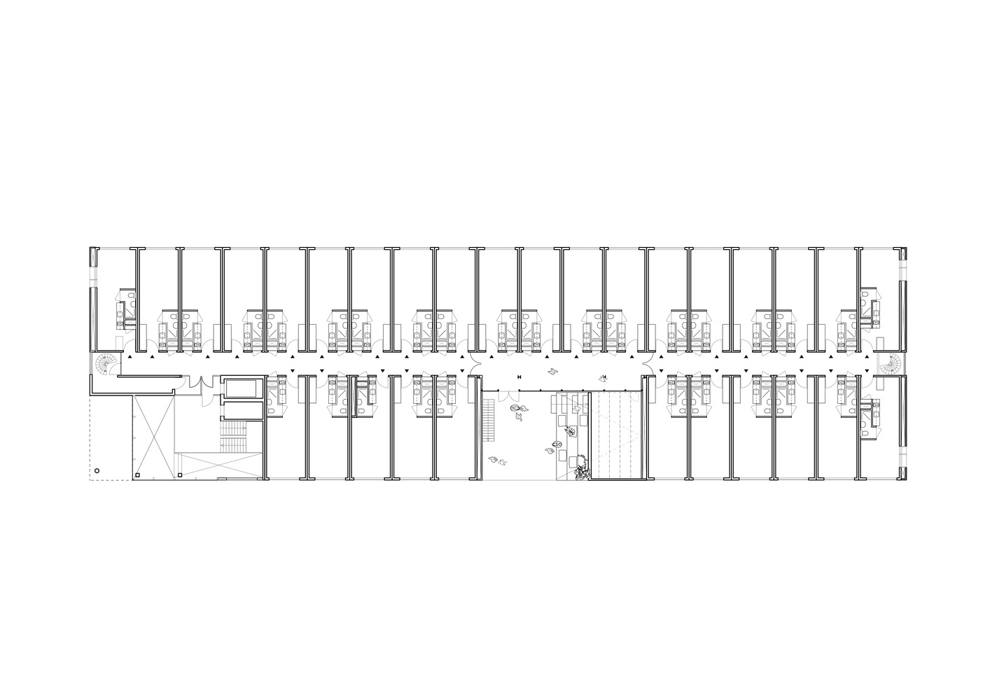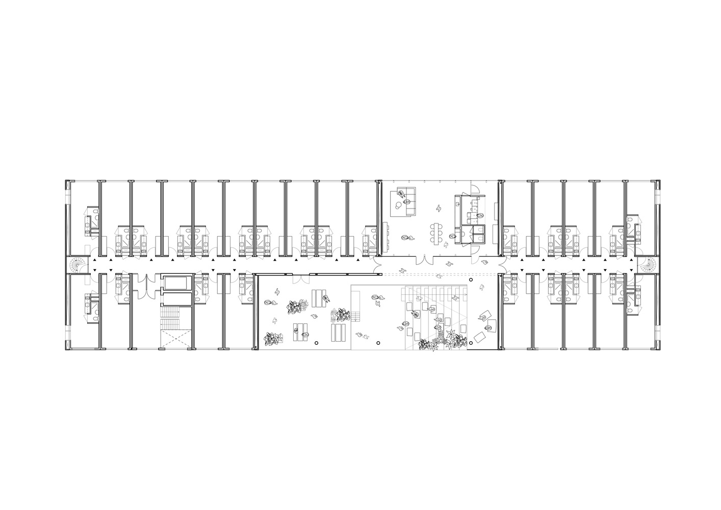 The residential floors and the cycle storage on the ground level are each organized around and connected to the Heart in their own way. This creates a distinct experience on every floor, with the Heart serving as the central connector in Suite 9's circulation.