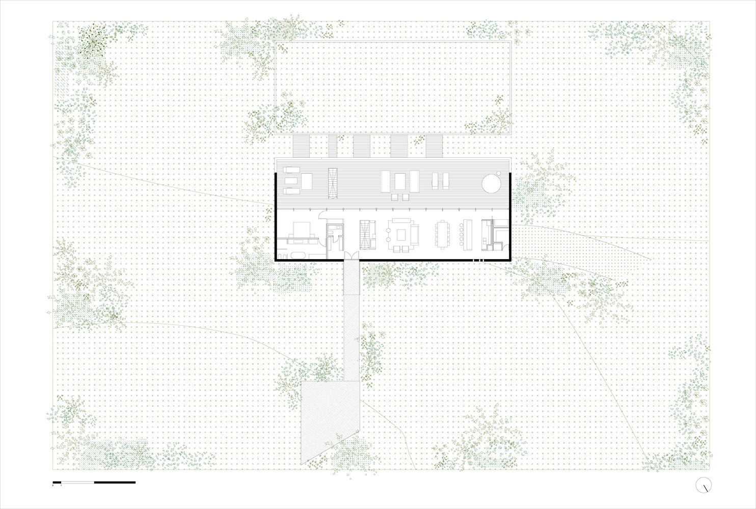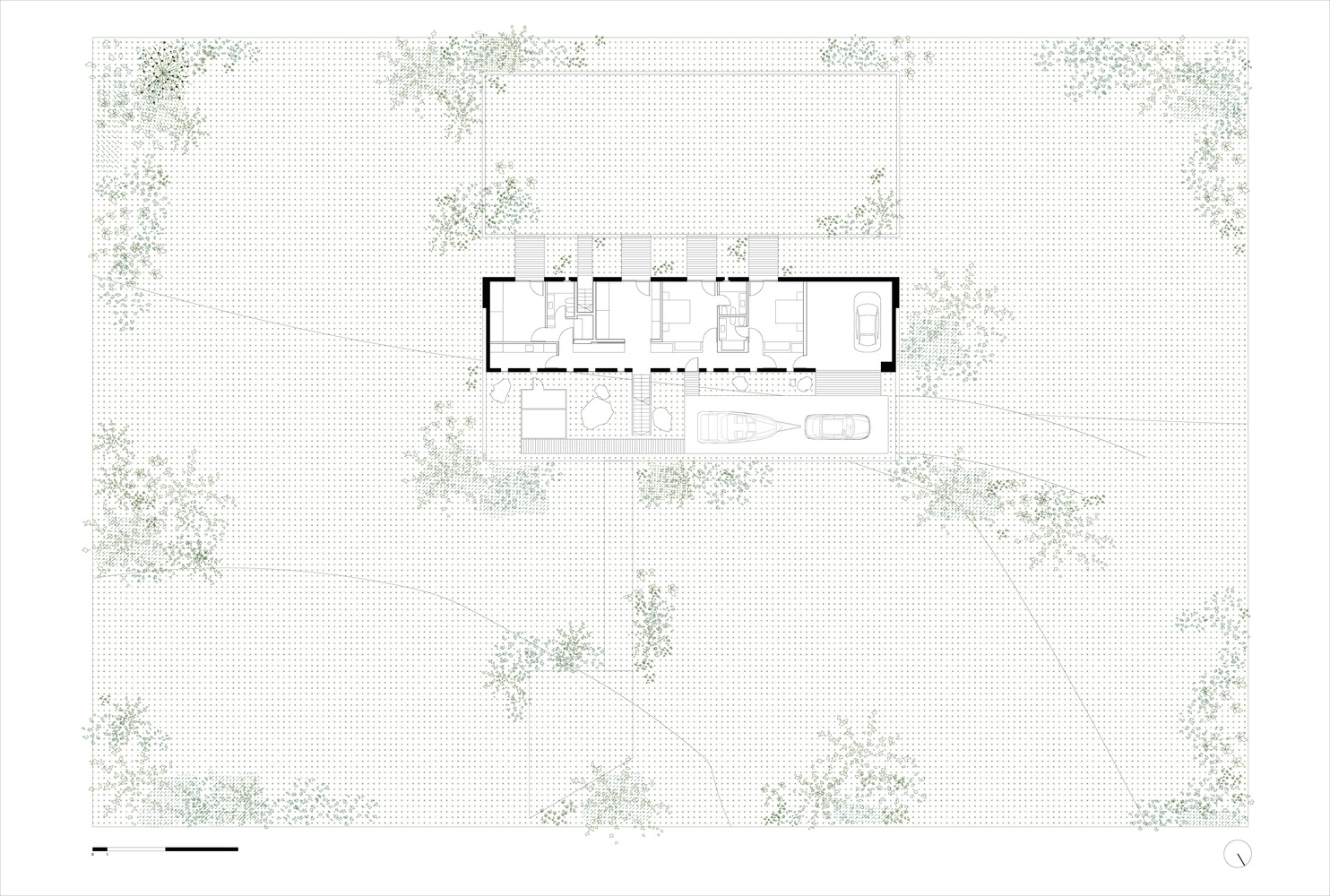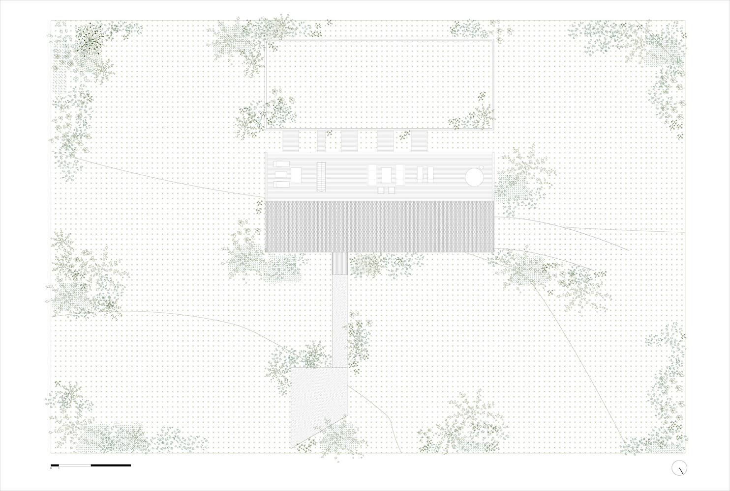 To preserve the existing vegetation, the project proposes two volumes: one housing the residence and the other, a garden elevated above the original landscape.