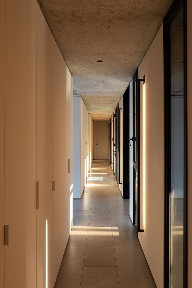 To take full advantage of the views, the traditional layout of the house is inverted. The living spaces and the main bedroom are placed on the upper level, while the children's bedrooms, guest rooms, and service areas are located on the lower level.