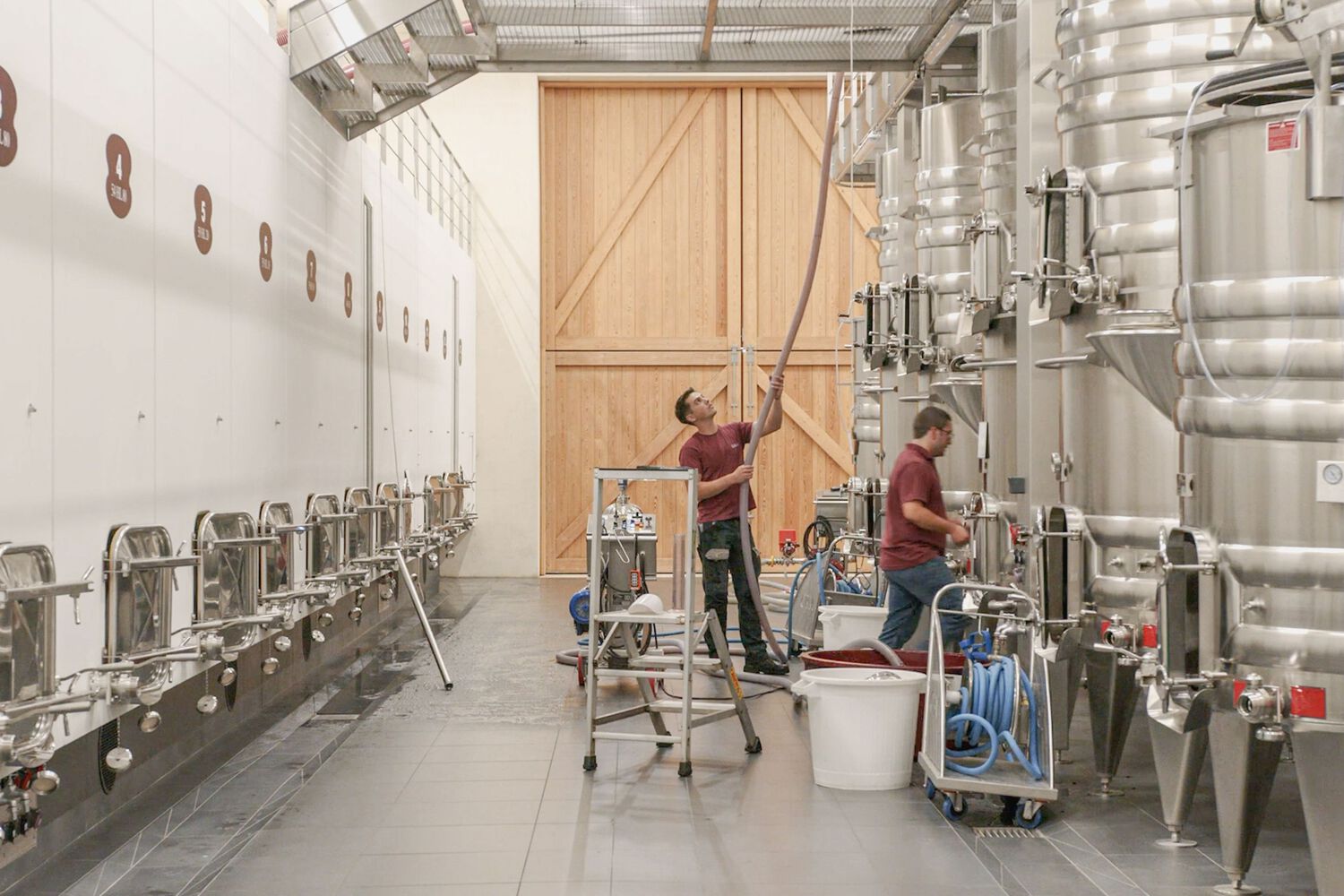 On the façade, horizontal and vertical slits subdivide the large volume of the new building and bring natural light into the main winery. The large wooden doors on the south facade, similar to freestanding furniture elements, recall elements of medieval vernacular and allow the workspaces to open to the outside during the harvest period.