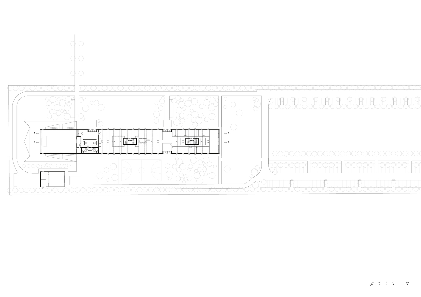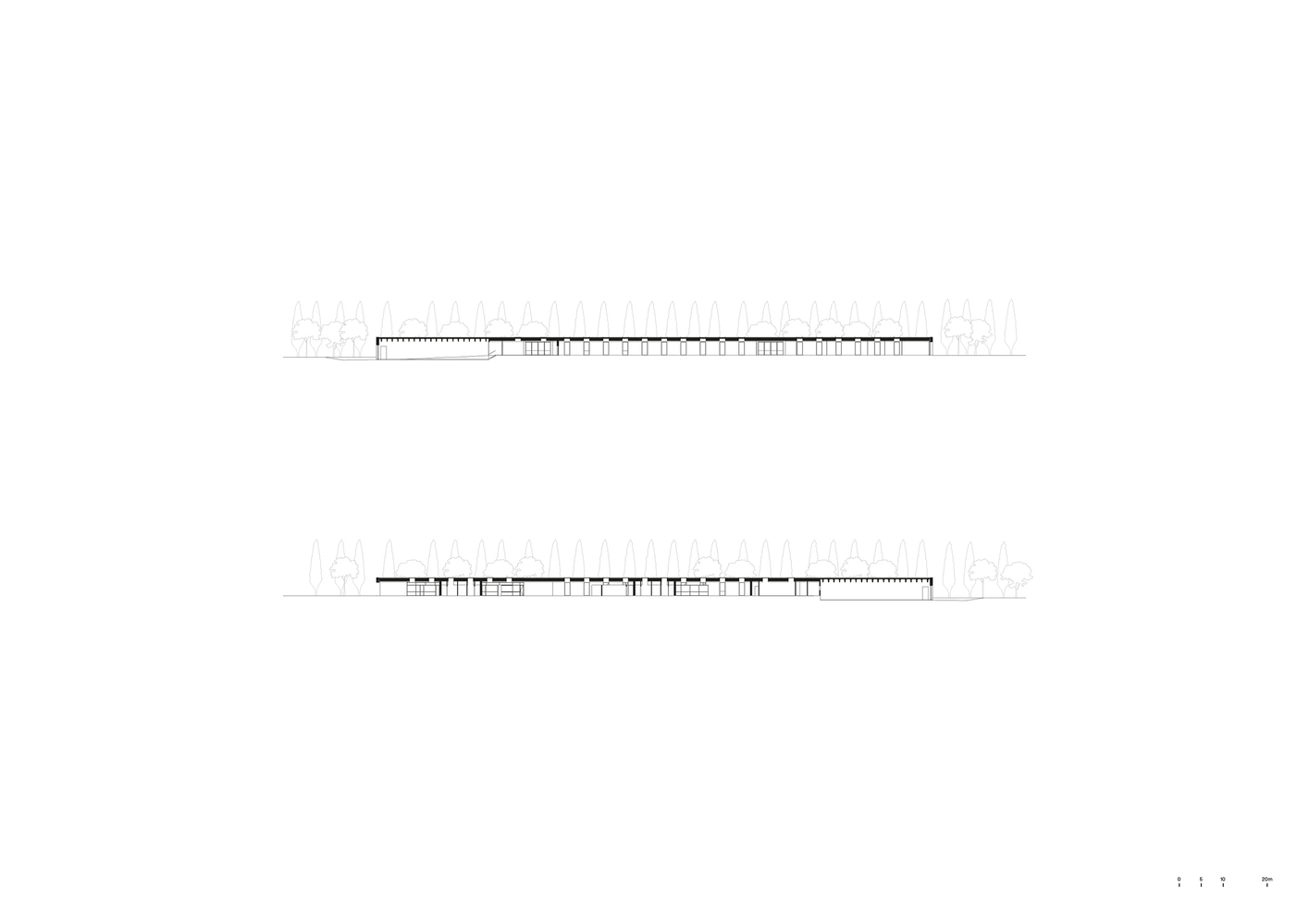 The east and west façades are scanned with concrete walls and full-height glass partitions, while the north and south fronts are fully glazed;