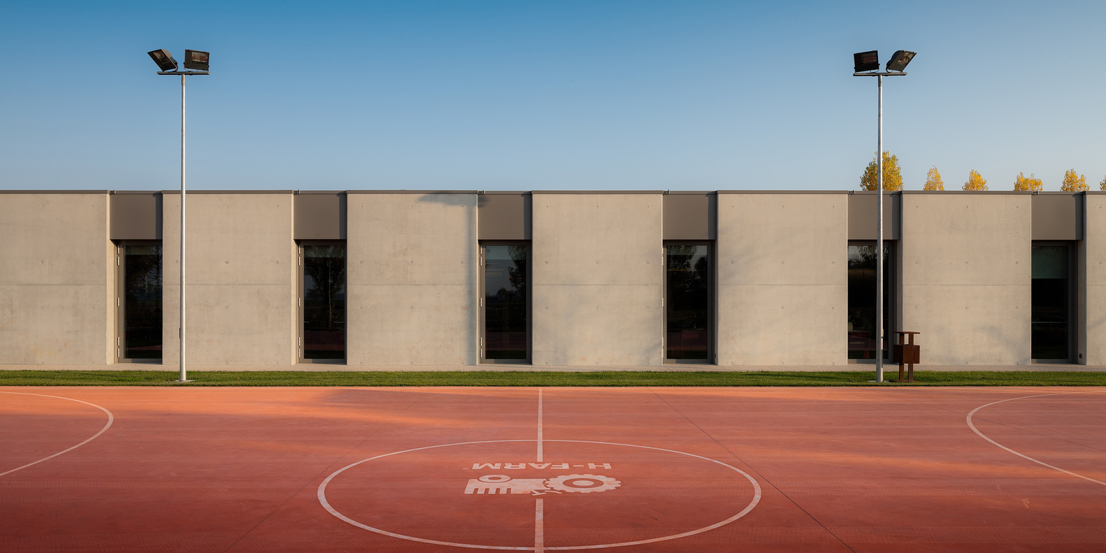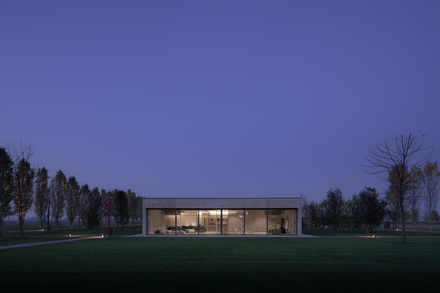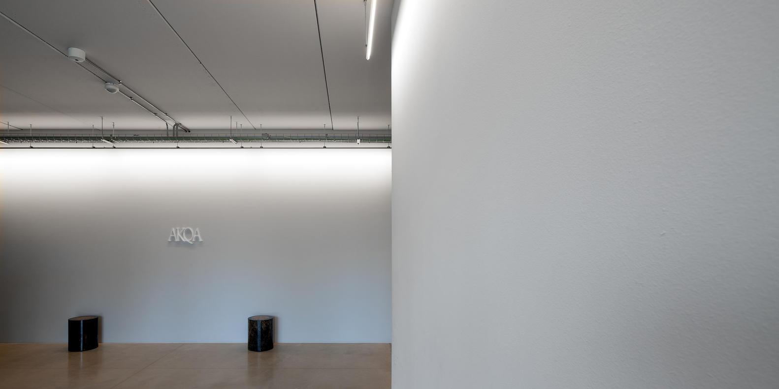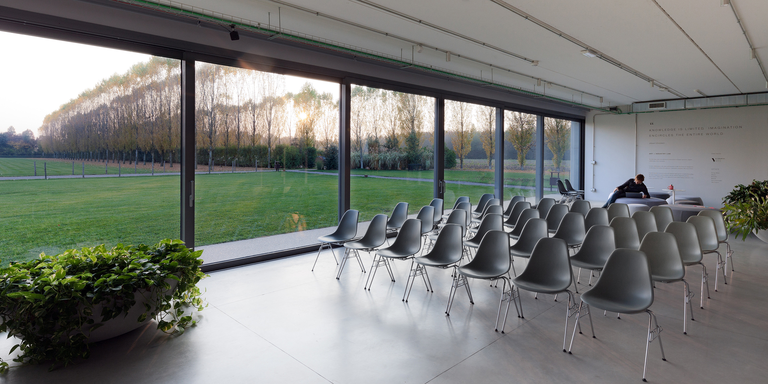 The AKQA offices venue, located in a plot once occupied by a livestock building, is an elongated one-level pavilion with an open plan, ending on the north side with a large conference hall, nestling on the ground and open to the countryside view.