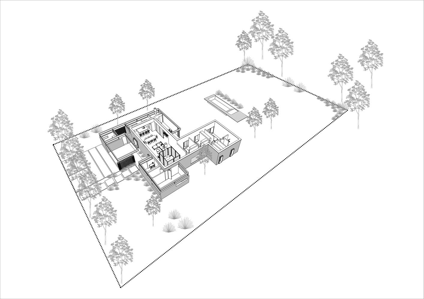 The private area consists of a master suite, two bedrooms, an office, and an additional bathroom. Each room features strategically placed openings to connect with the garden and ensure privacy for the house's inhabitants.