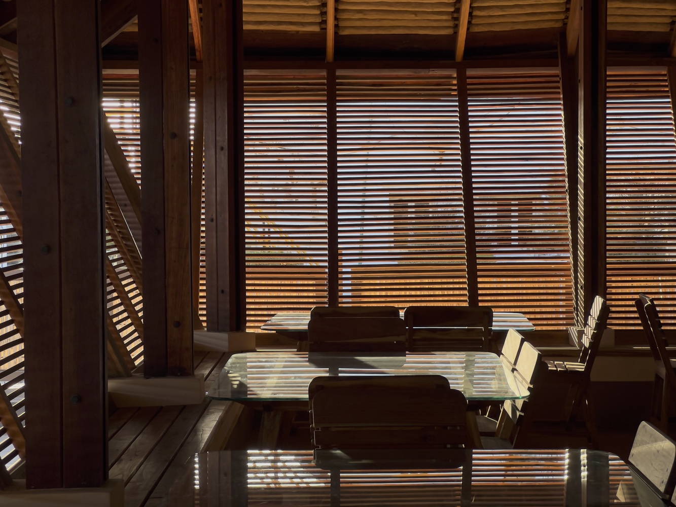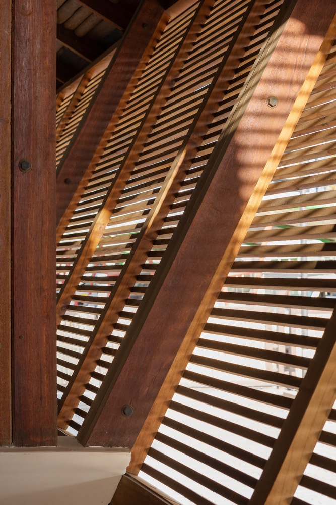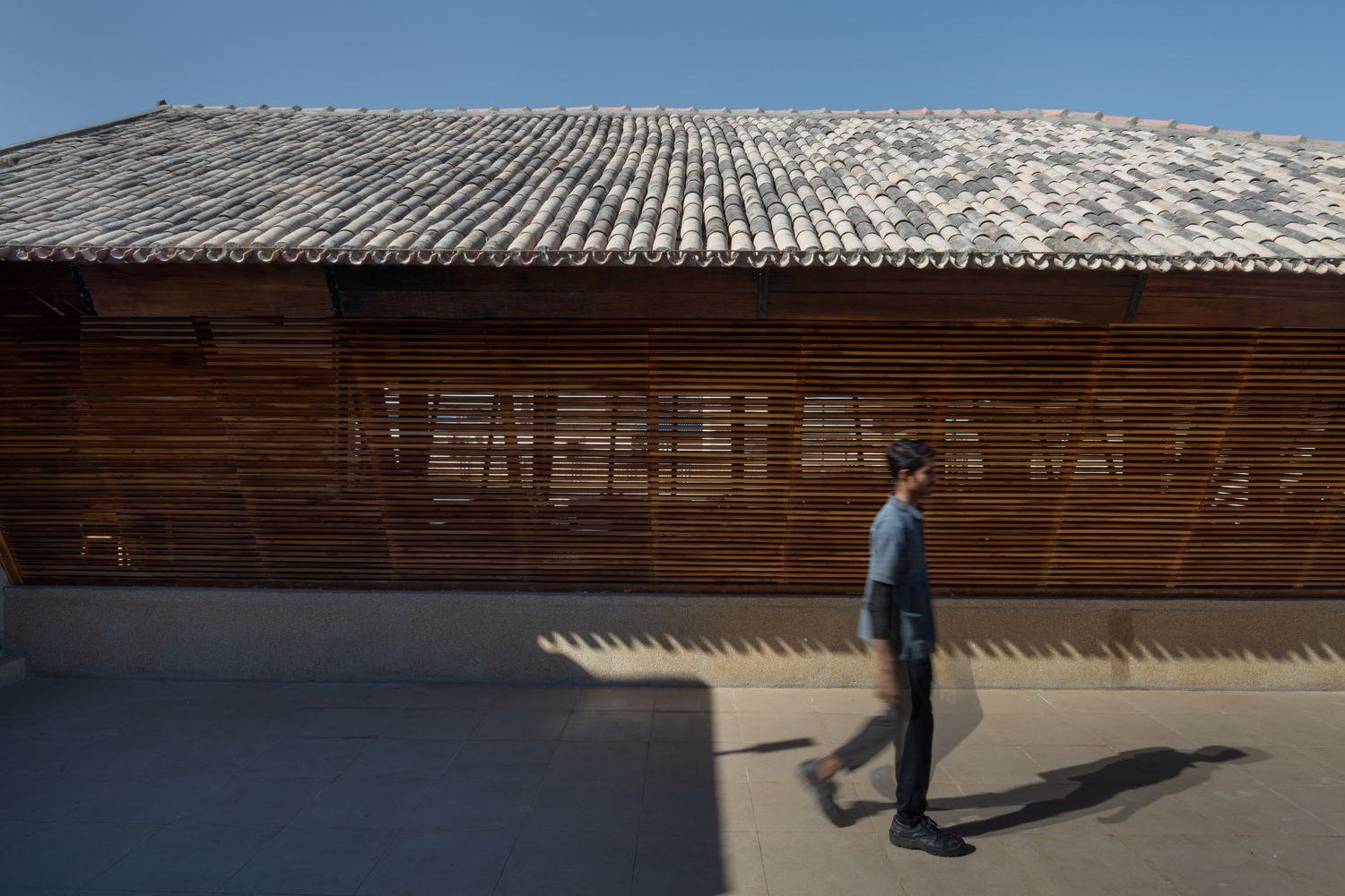 Horizontal wooden jaalis, fabricated from scrap timber sourced at local sawmills, clad the exterior of each dining bay.