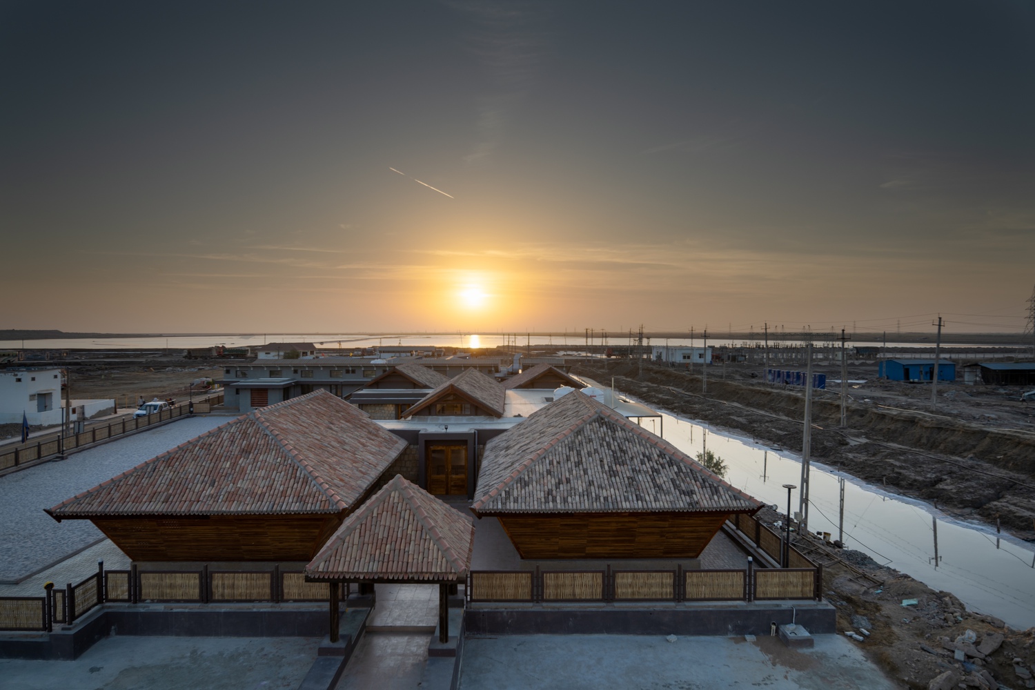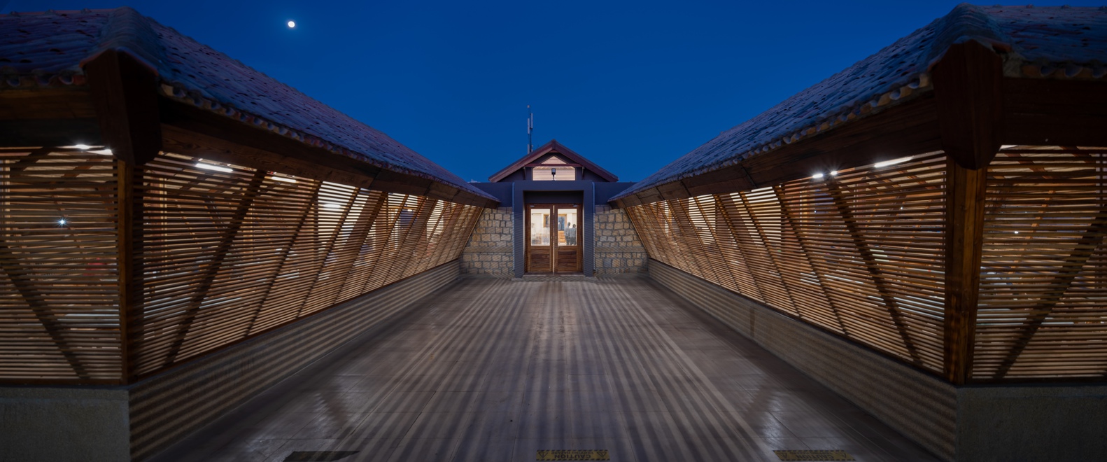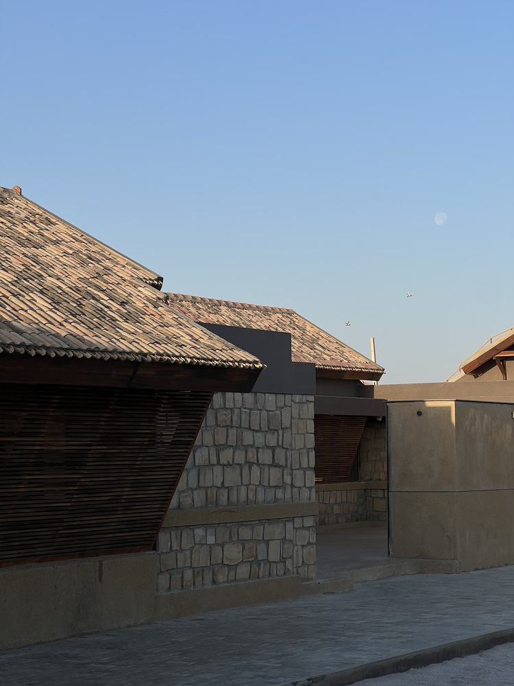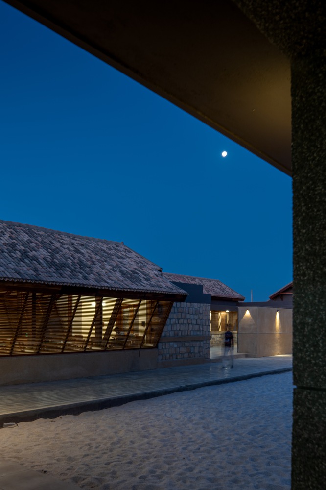 The mud rolls, composed of wool, discarded jute bags, clay slip and lime, and upcycled wooden battens, provide exceptional thermal performance, mitigating the harsh desert heat.