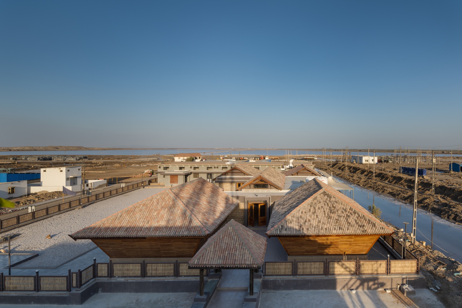 The architectural expression of the canteen offers a deliberate contrast to the surreal landscapes of the white desert and the industrial nature of the plant.