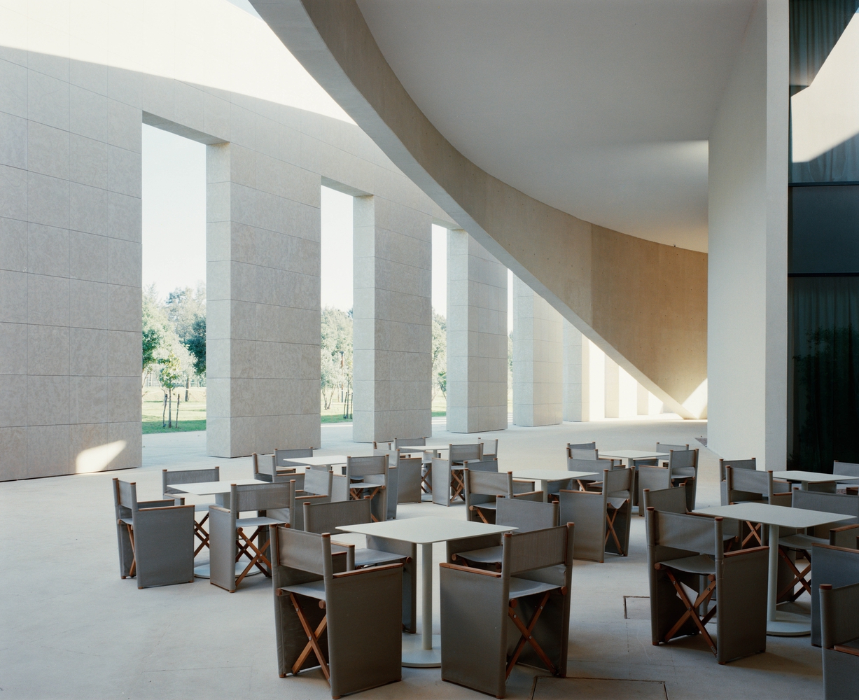 The circle, a sweeping free-standing wall, forms a ring around the main auditorium, the square.