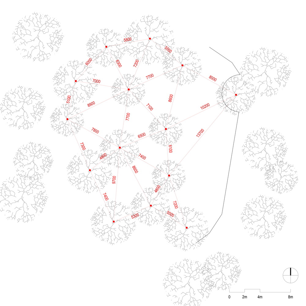 Before design started, we measured the distance between the trunks of every two trees, and plotted the exact location of each tree through triangular geometry.