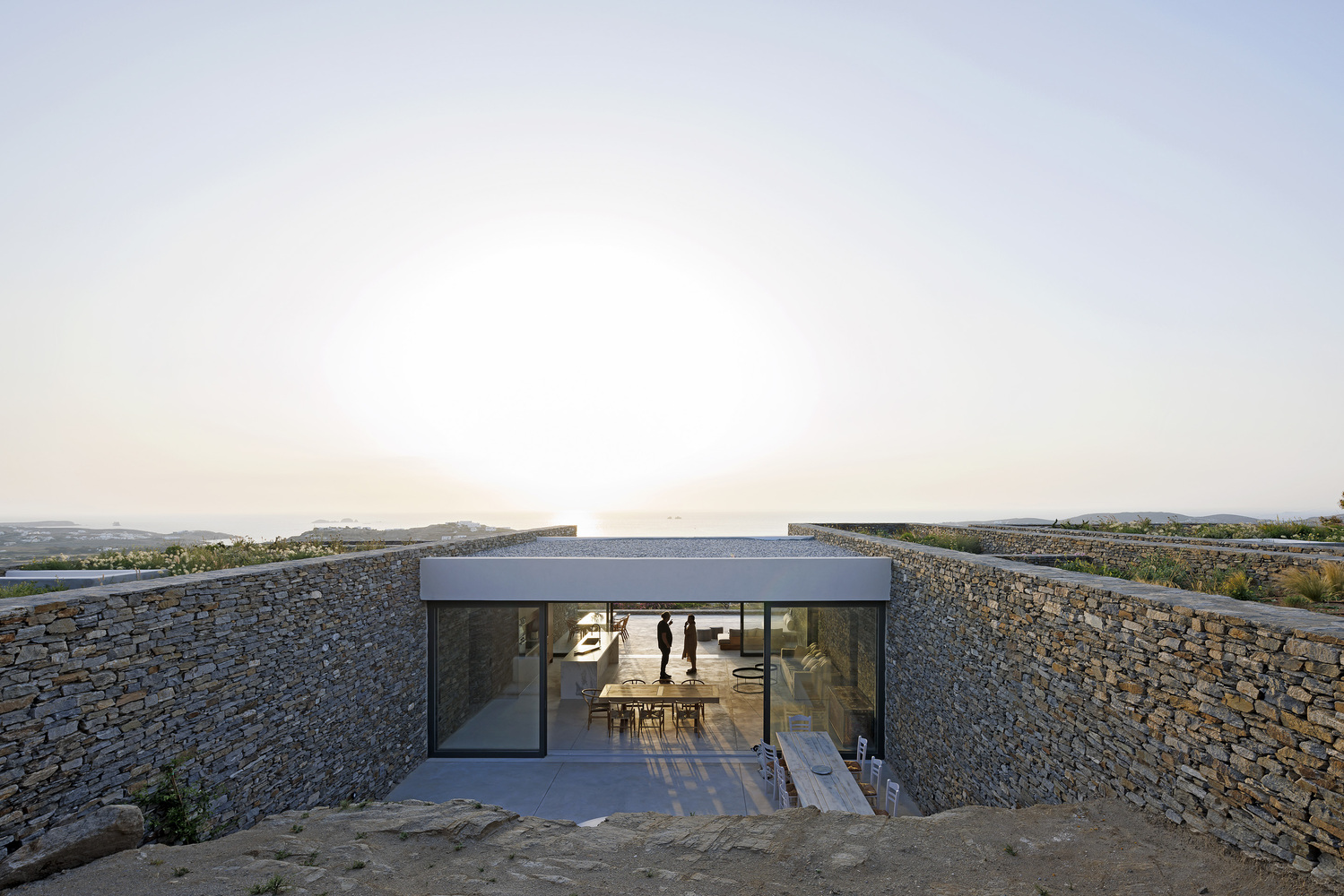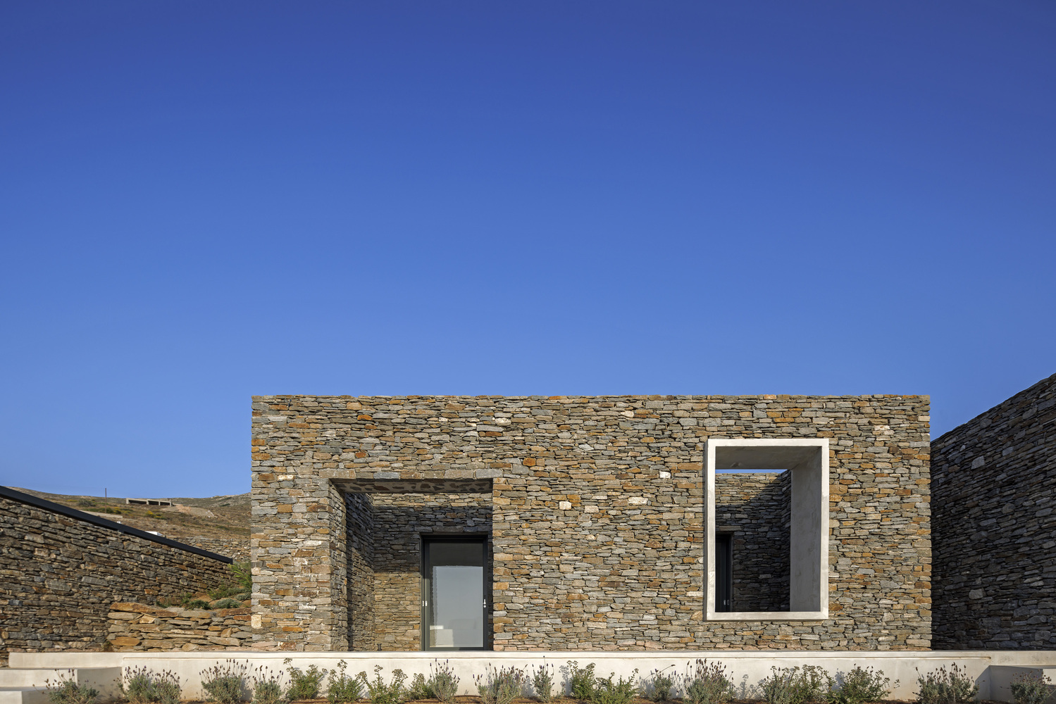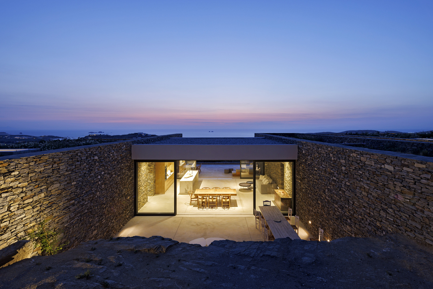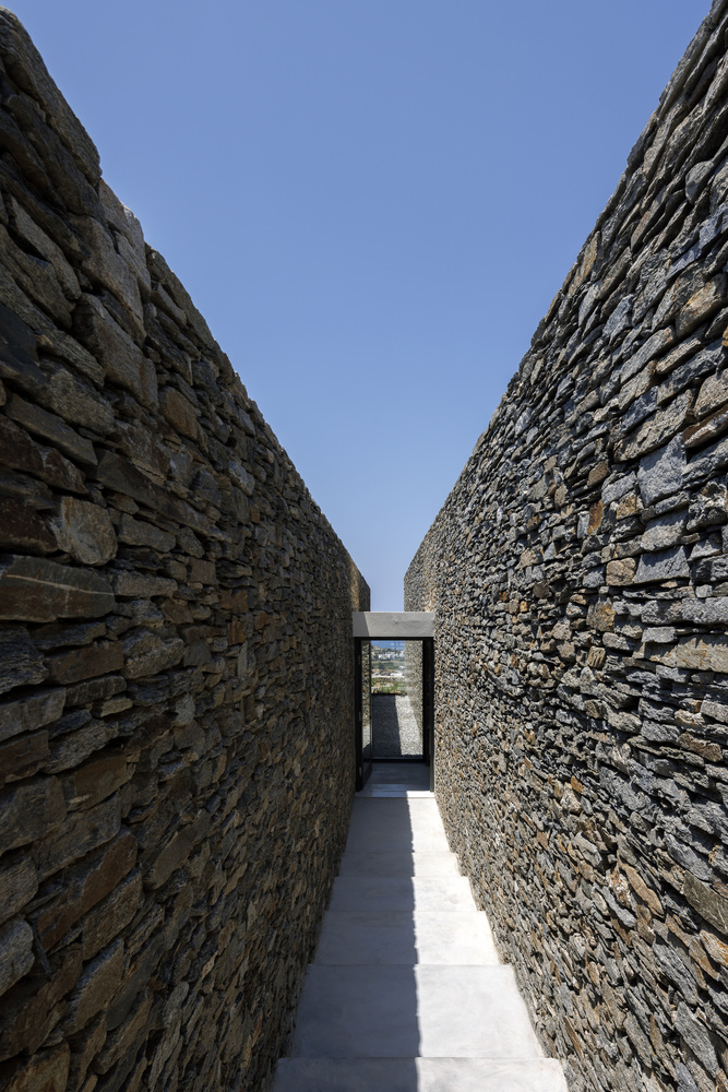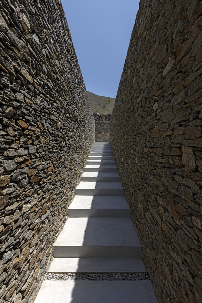 The residence serves as a continuation of the natural terrain, declaring its presence through the simplest form of stone walls that demarcate human intervention.