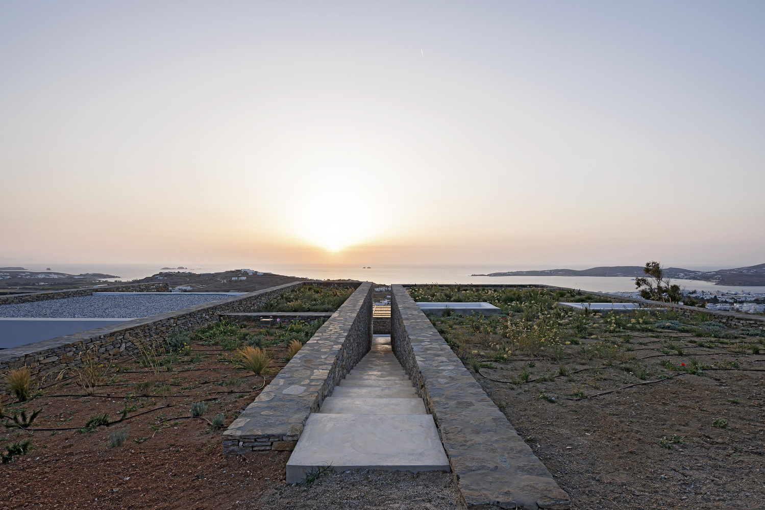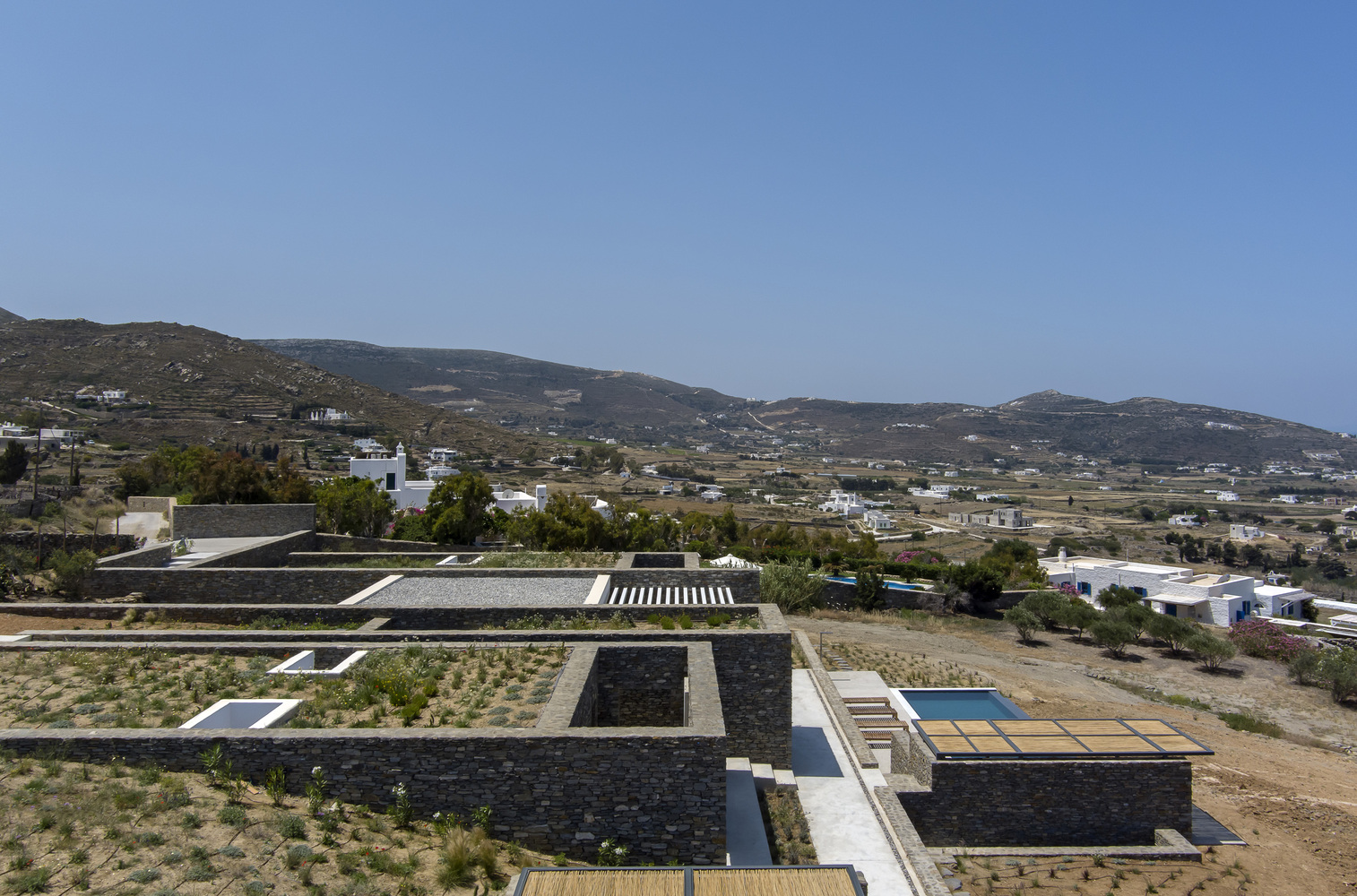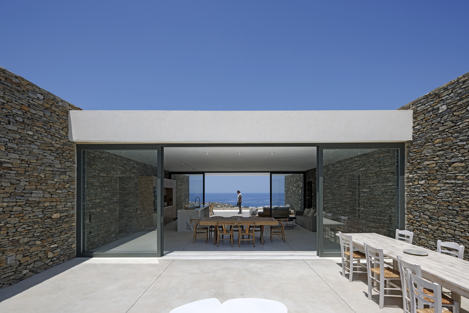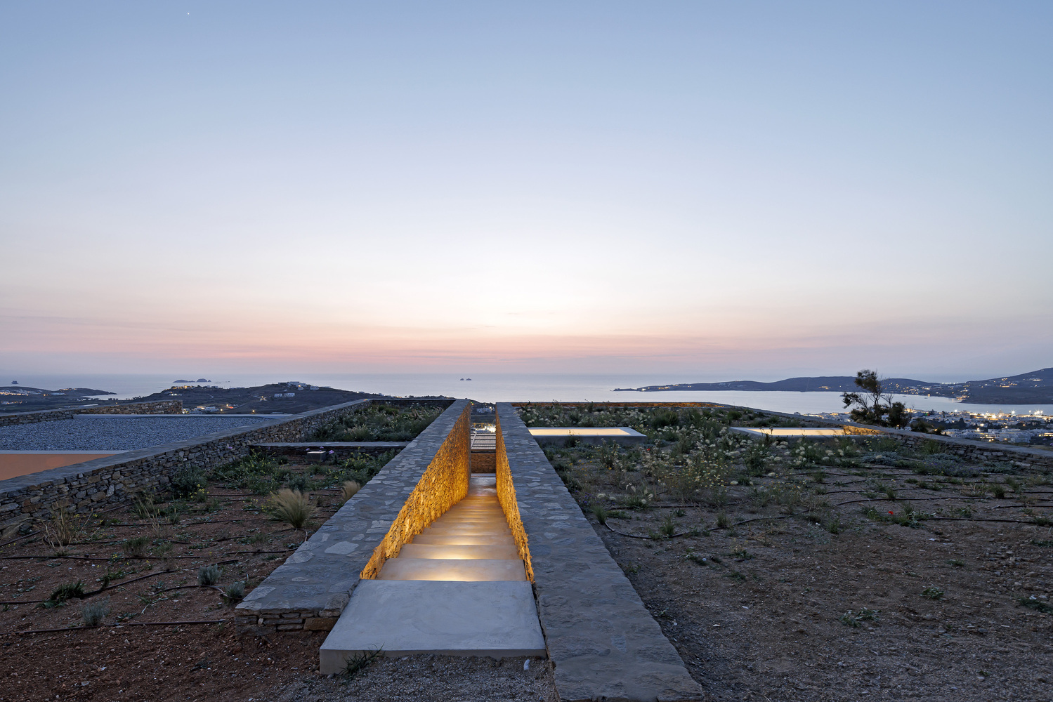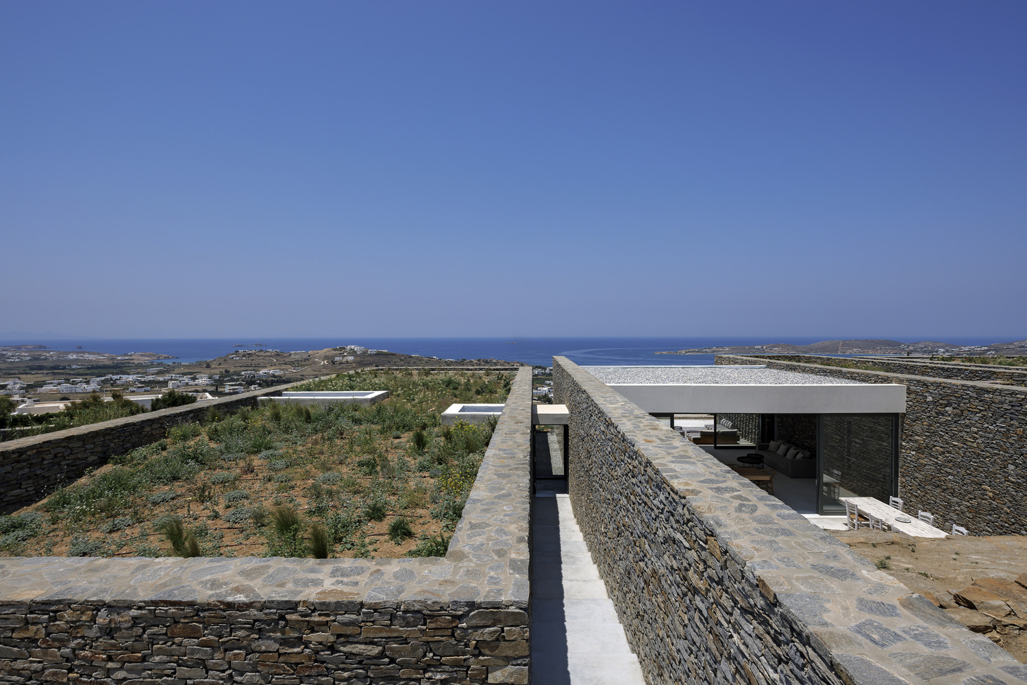 The residence serves as a continuation of the natural terrain, declaring its presence through the simplest form of stone walls that demarcate human intervention.