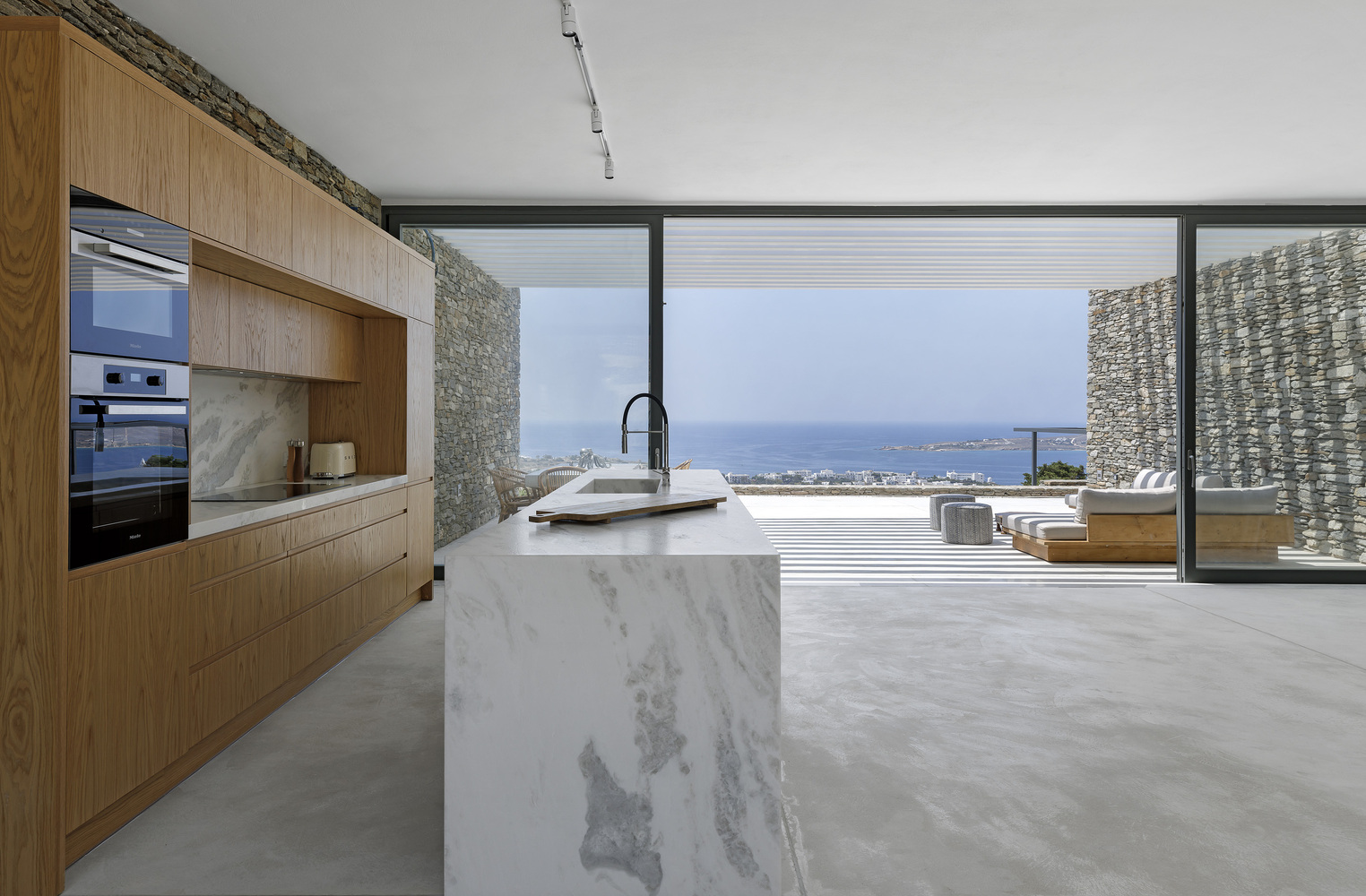 The roof slab, made of visible concrete, rests upon the stone walls and shelters the living space. The rock, the landscape, permeates the interior and then turns toward the view and the sea.