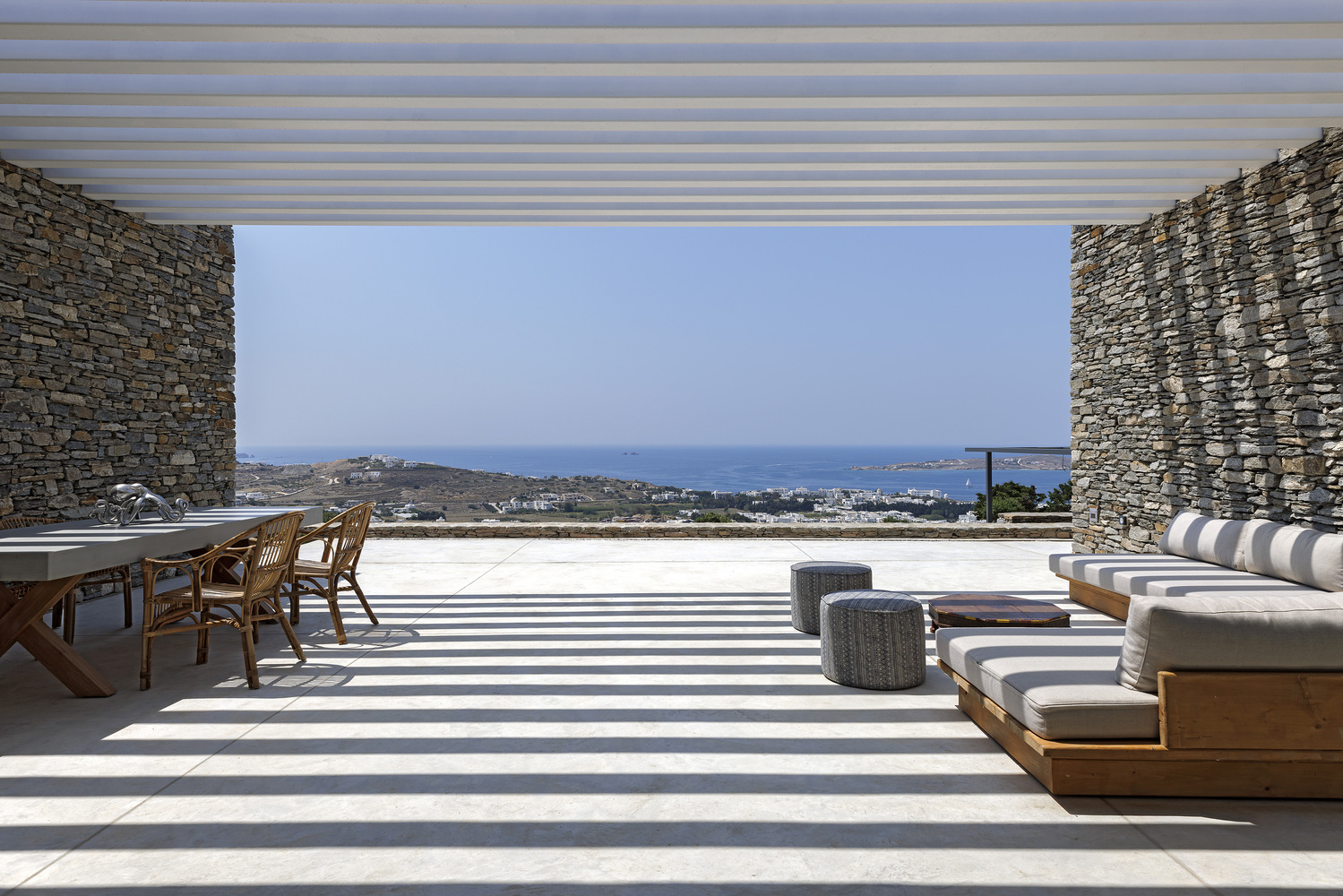 The expansive pergola, as an extension of the reinforced concrete covering, merges the interior and the exterior, unifying the rock, the living room, the courtyard, the view, and the sea into a single sequence.