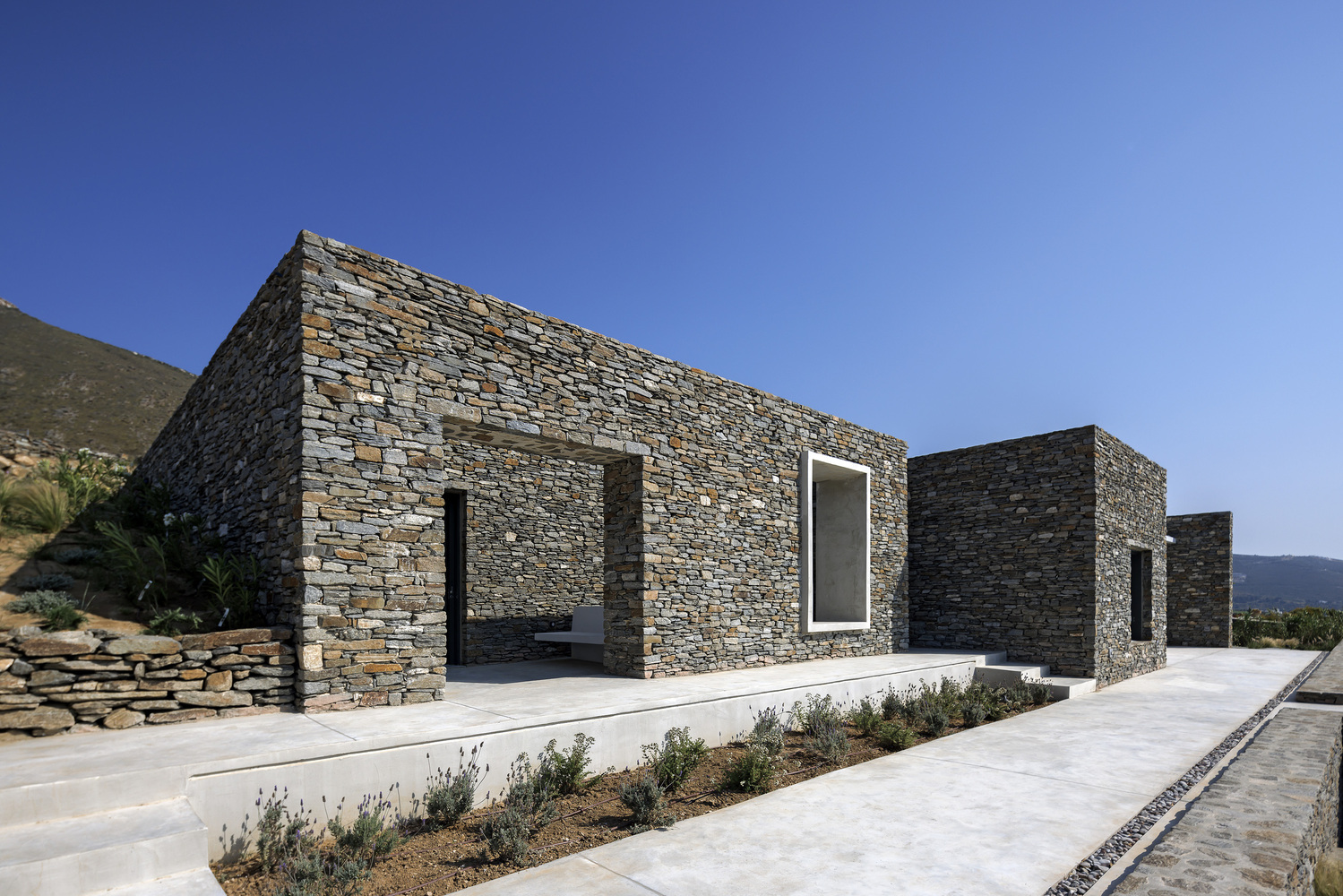 The design drew inspiration from the dry-stone walls and geological formations of the area, seamlessly blending into the landscape like a stone structure that harmonizes with its surroundings.