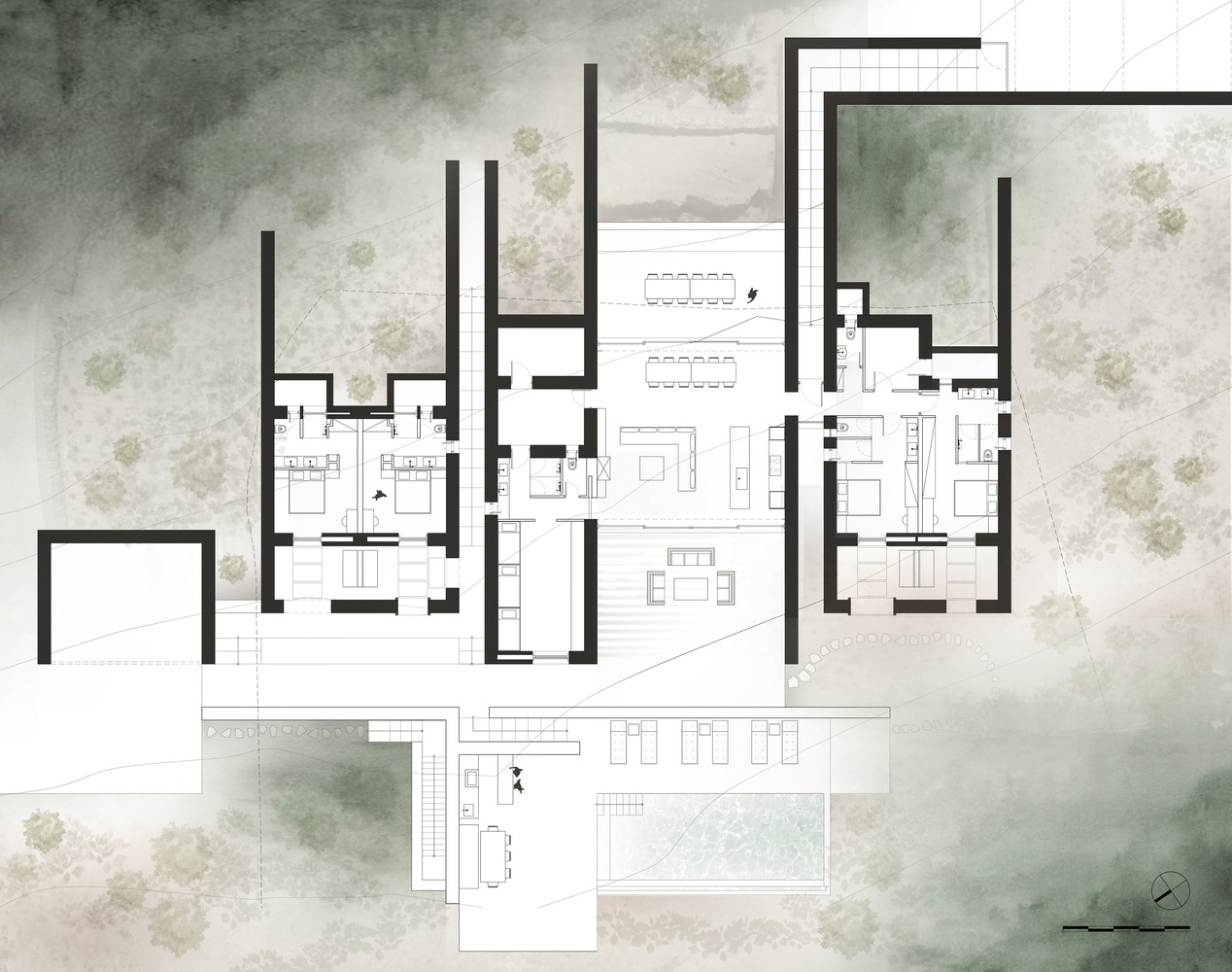 The entrance is located on the eastern side of the plot, at its highest point. As the walls traverse and intersect the dwelling, enclosed courtyards are formed on the western side to protect the bedrooms and establish areas of privacy.