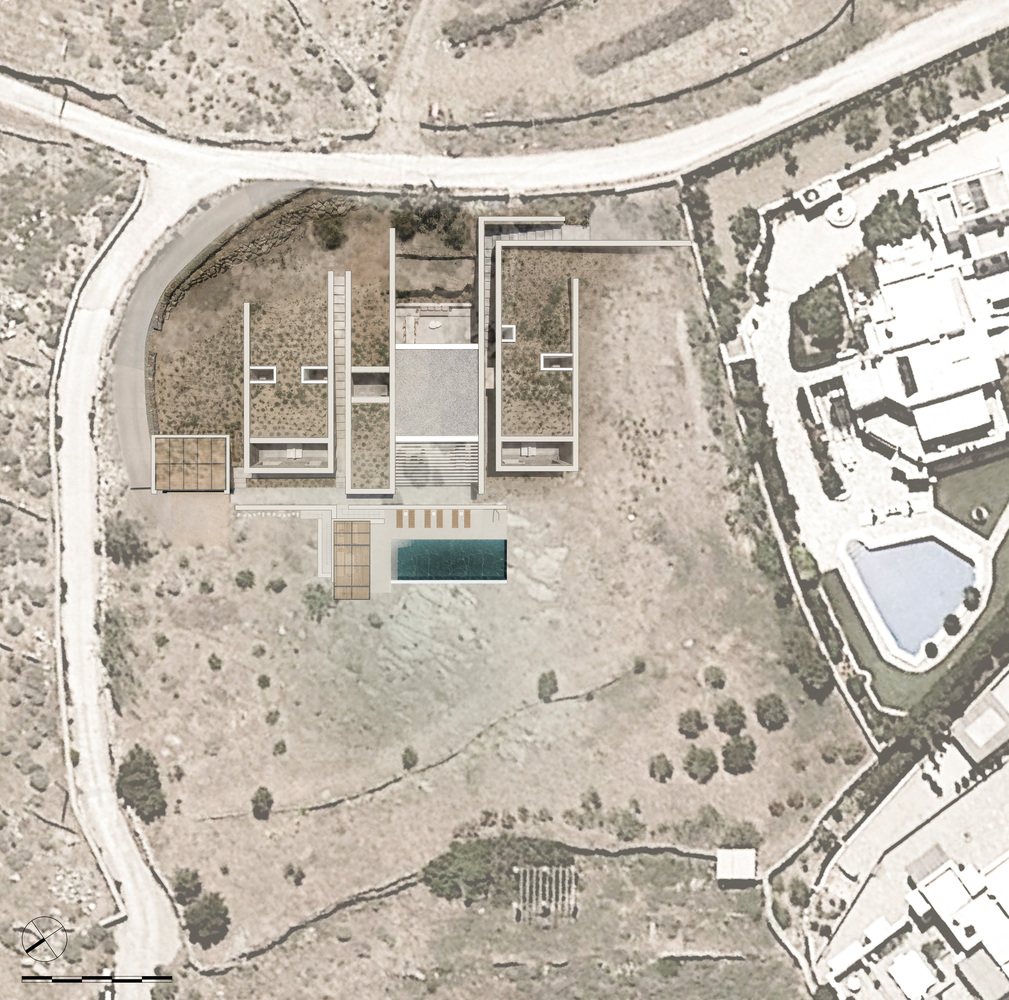 These walls mold the building adjacent to the landscape, the place, the stone. While traditional retaining walls, the "pezoules," evolve in parallel with the topography and elevation relief, the residence's walls penetrate the ground, emerge from it, and subsequently shape living spaces.