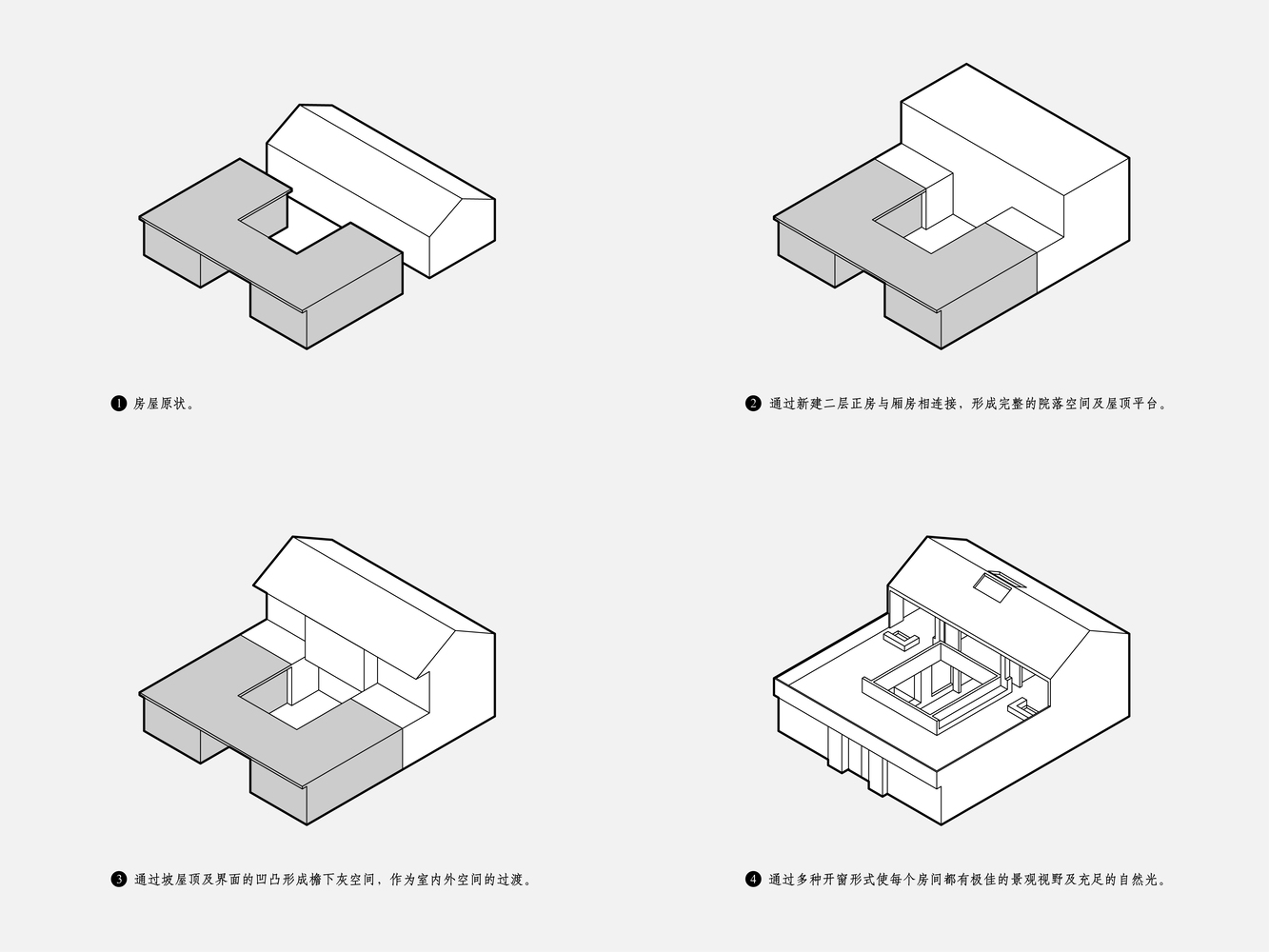 In our design, we connect the principal and wing buildings directly, reshaping the boundary between interior and exterior, creating a new courtyard that is inward and stable in connection with each room.