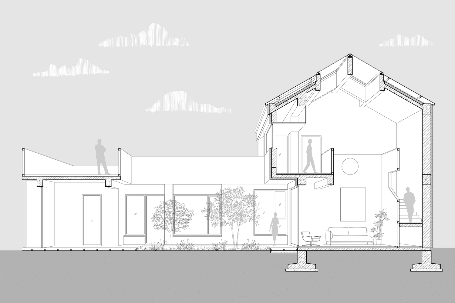 The skylight on double pitch roof creates a spacious and bright double height living room.