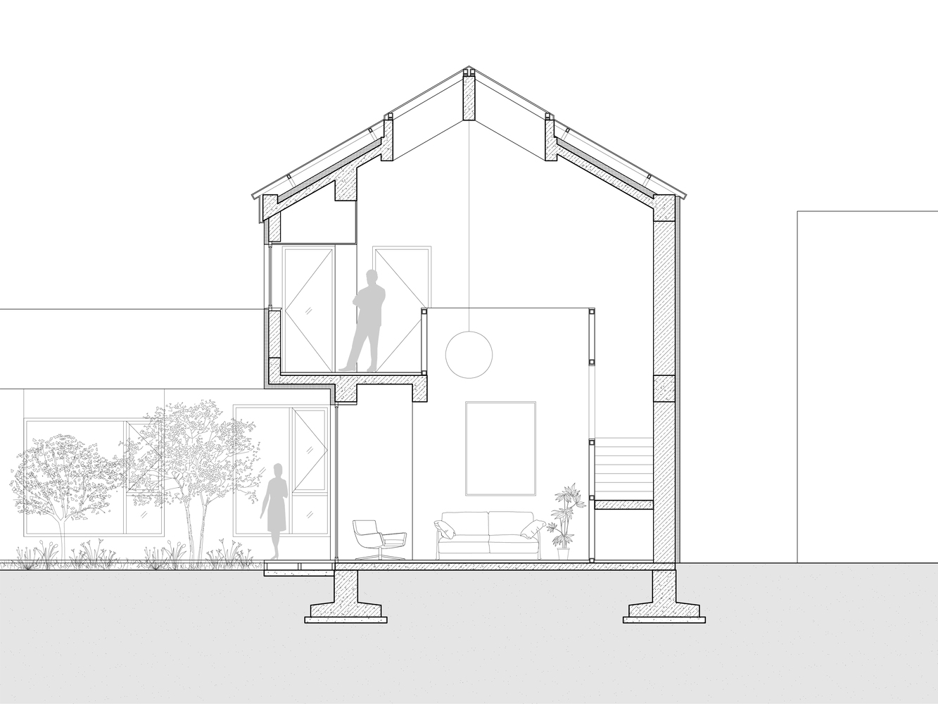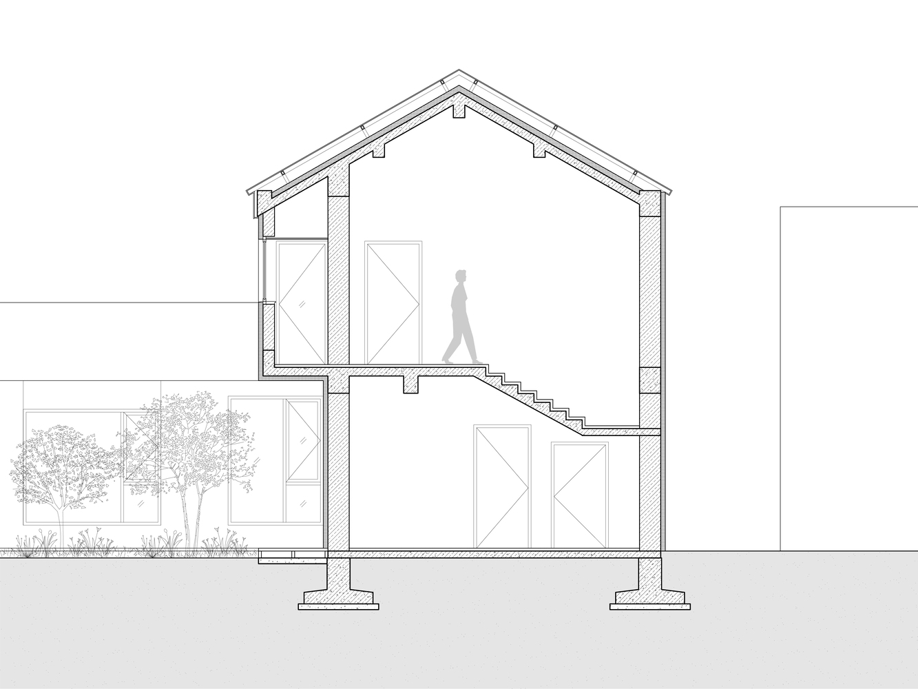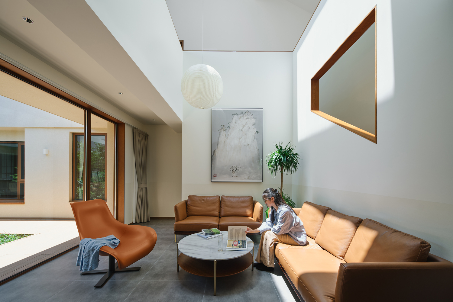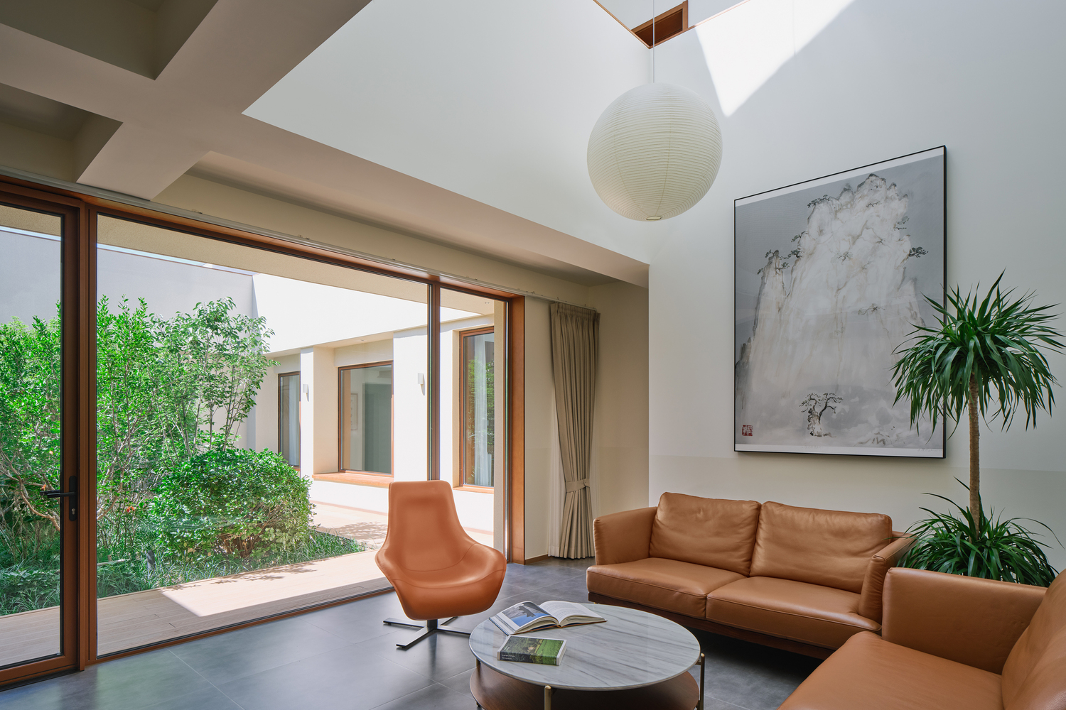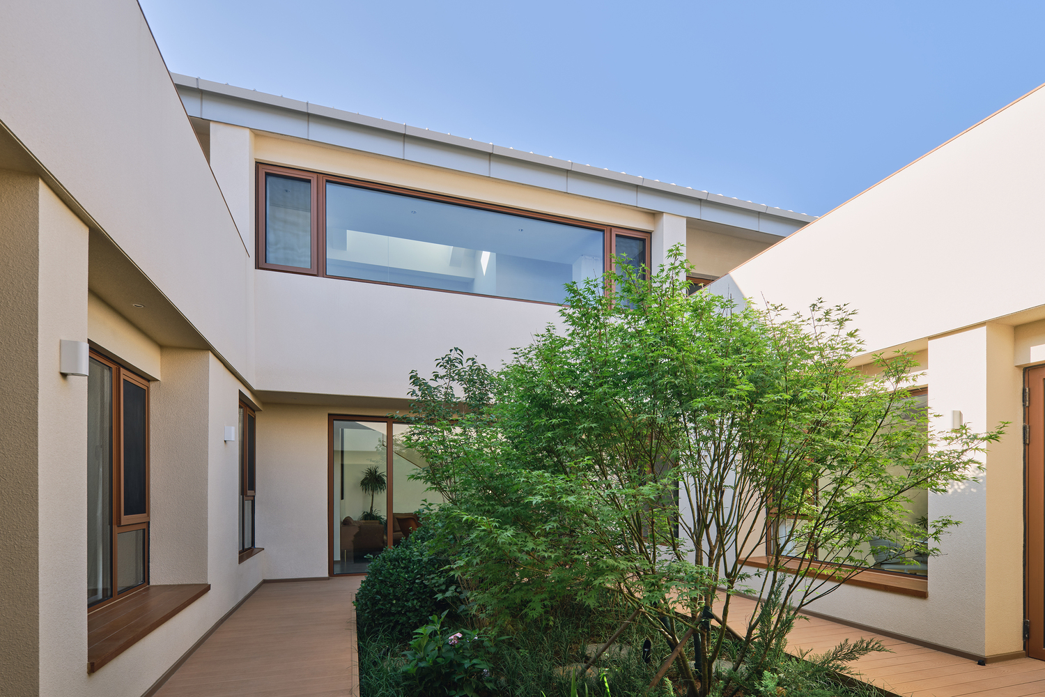 The French window of living room on the first floor allows the view of courtyard to be appreciated fully and directly, and the cantilever eave makes the view from living room extending towards the courtyard, also creating exterior gray space under the eave.