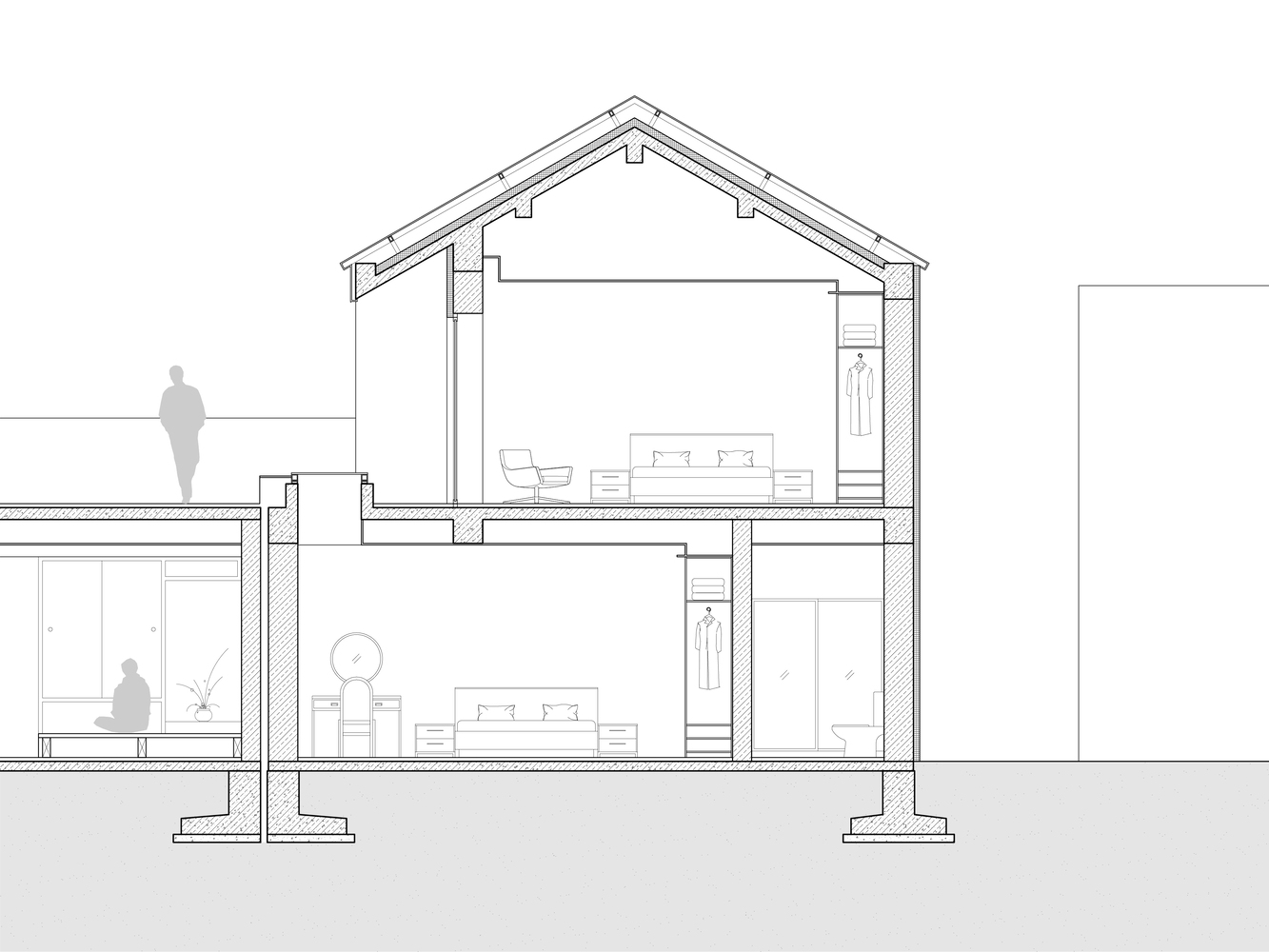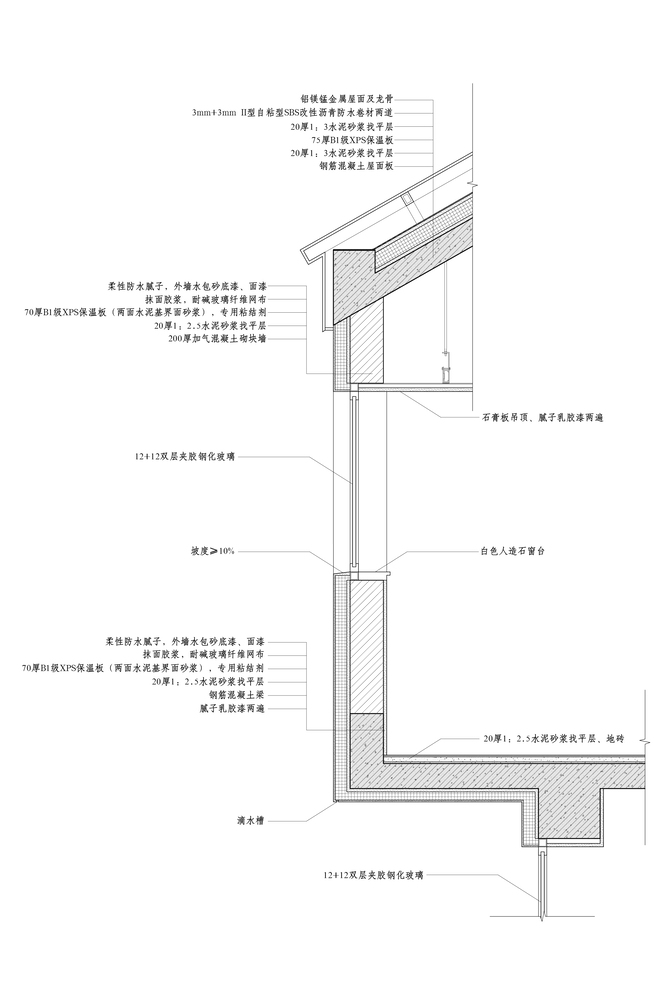 Overturning beams on roof leave space for rigid insulation and waterproofing, while making the eave beam visually not too thick. On the second floor, overturning beam is hidden in the sill of the horizontal long window, making the soffit clean.