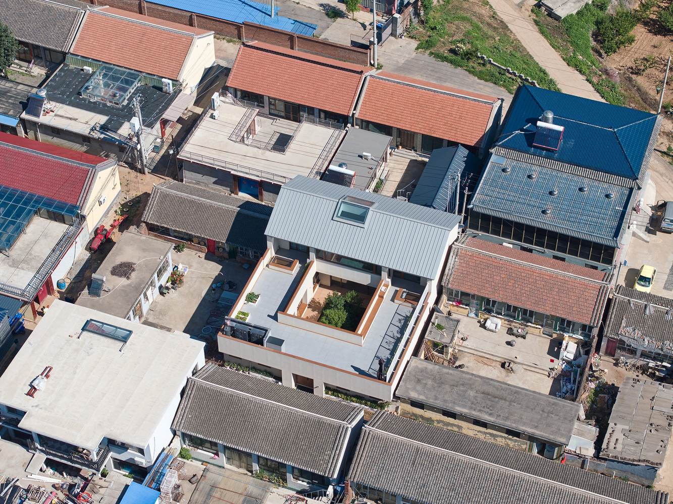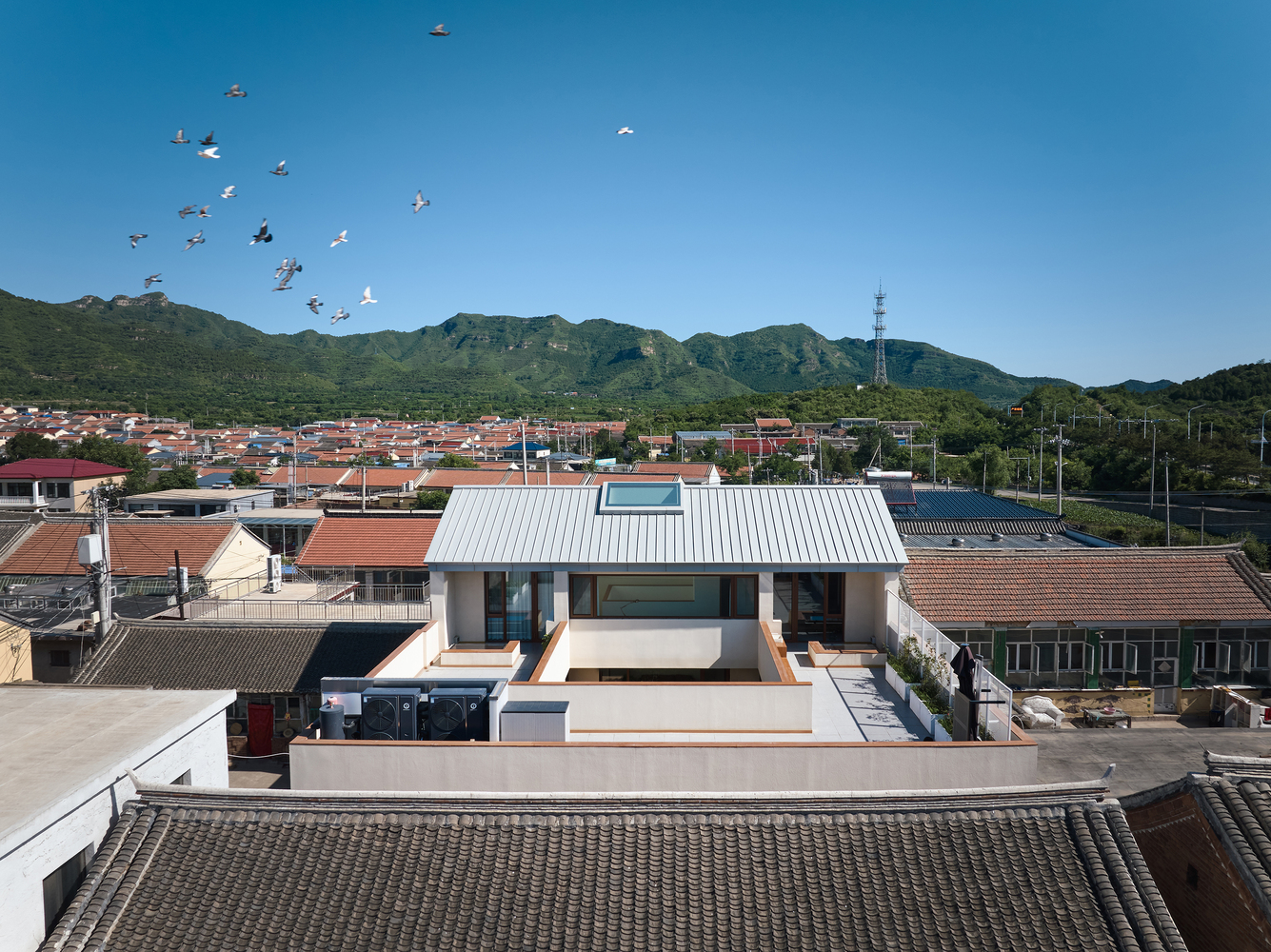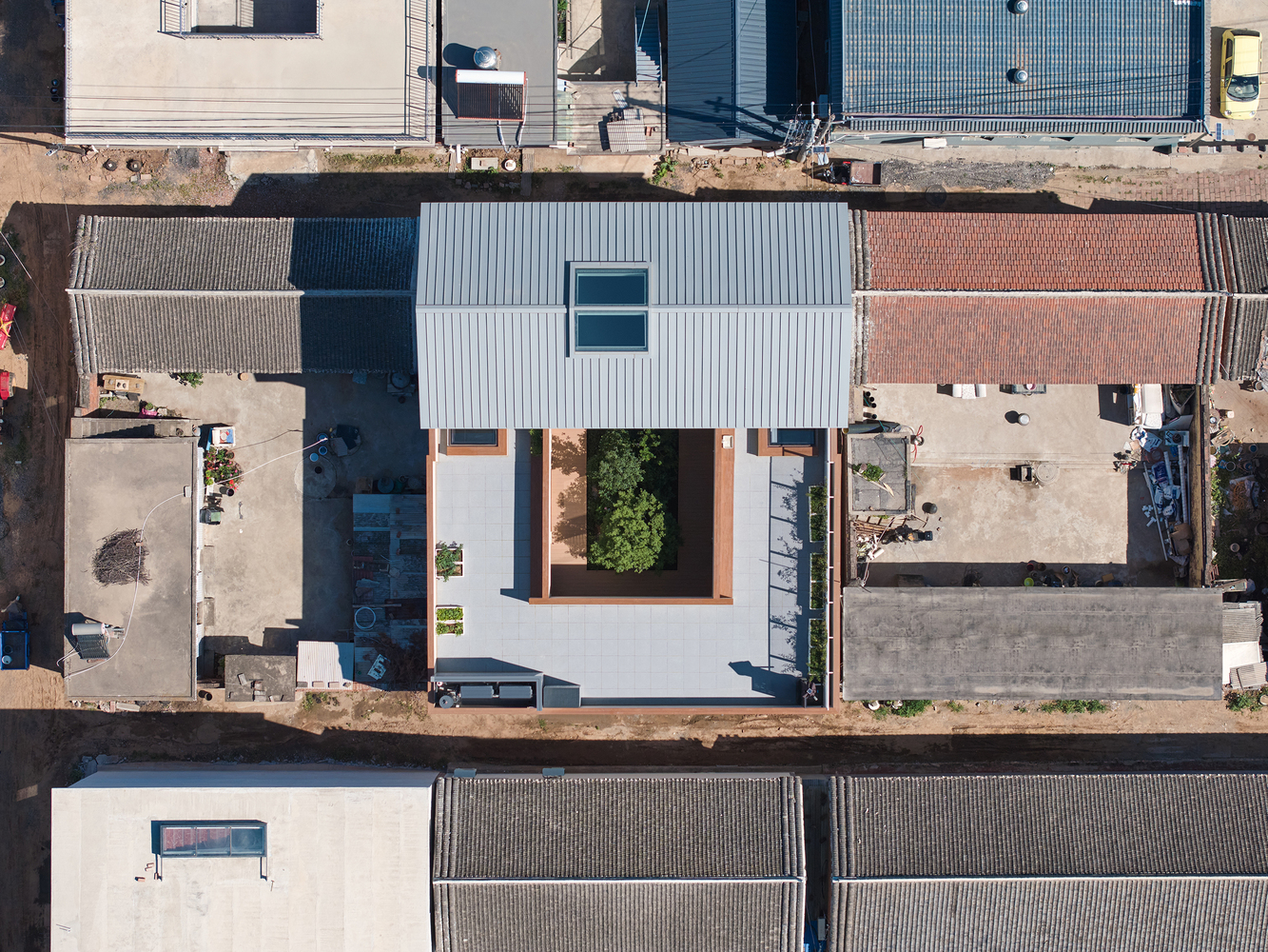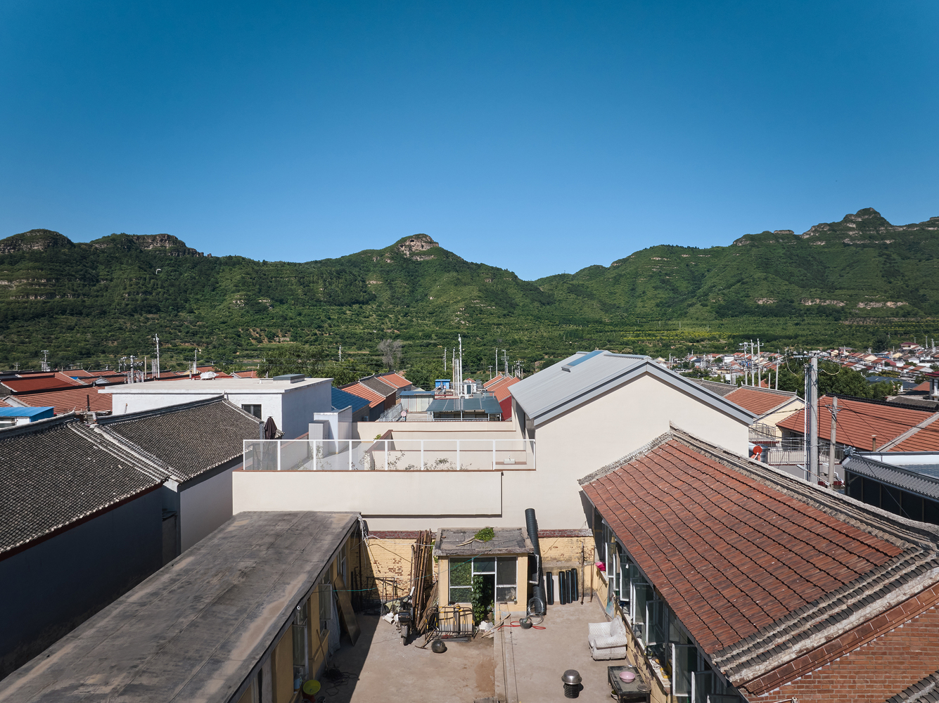In consideration of harmony with buildings in the neighborhood, the principal building is featured with double pitch roof with unorganized drainage, rain water is collected on the roof terrace and drained to the courtyard through downpipe that are hidden in walls.