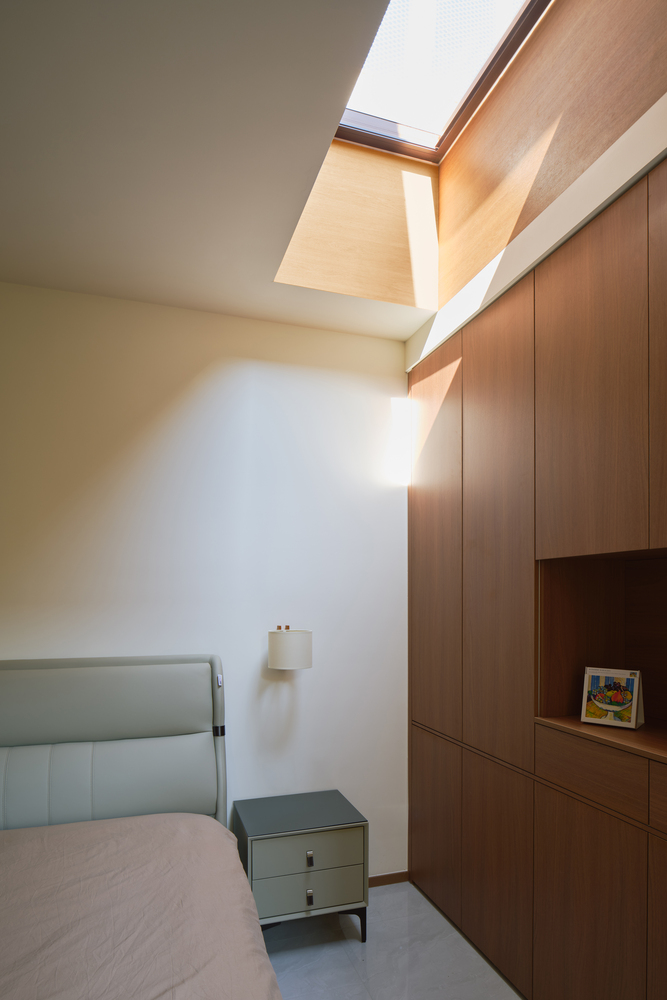 Bedrooms on the first floor of principal building is relatively poorly daylighted due to its adjacency to wing buildings and the eave of living room, so we bring skylight on top of the bedrooms, and the upper beams of the skylight form exterior seats on roof terrace naturally.