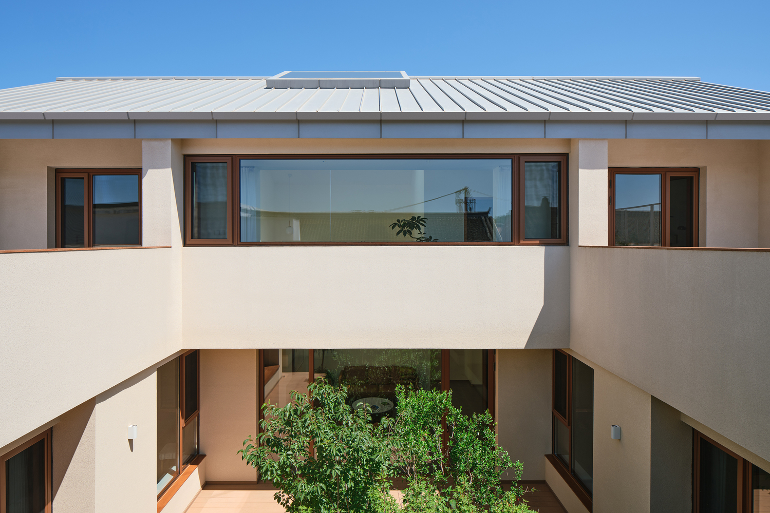 Sill of the horizontal long window of the corridor space along with the parapet of the roof terrace create a continuous boundary of courtyard.