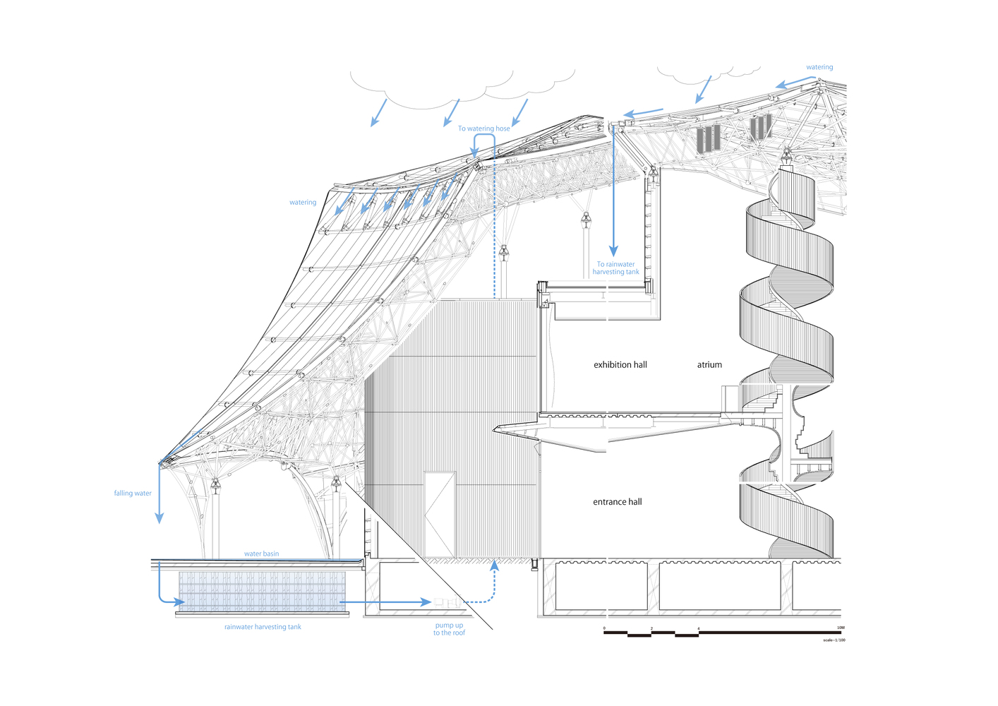 The wooden helical column in the atrium, inspired by DNA, symbolically supports the diverse roof forms.