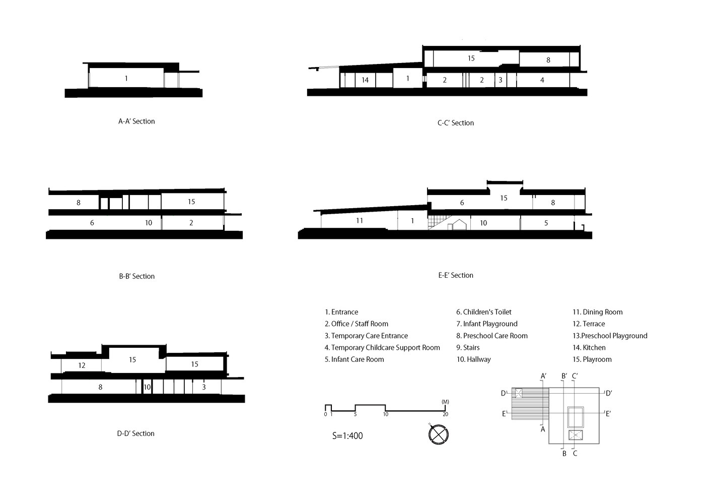 For instance, the dining room, adjacent to the main entrance, a kitchen, and a vegetable garden with a view incorporate food-related experiences in one's daily life.