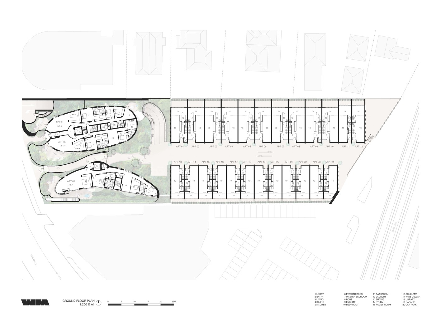 Across the master plan, the use of enduring and long-lasting materials, such as timber, stucco, rendered masonry, and zinc, is employed to create warmth, texture, and durability.