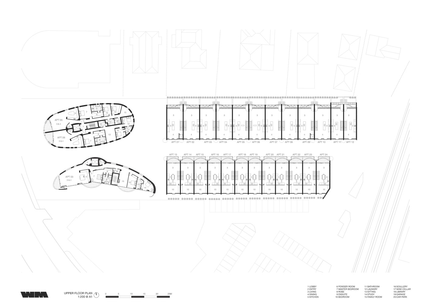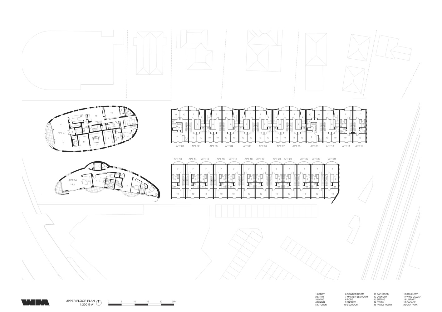 Their undulating façade establishes a finer-grain residential streetscape through softly fluted timber screens and overhanging terraces, which carefully control views and overlooking. This transitions seamlessly into the larger sculptural apartment blocks as the streetscape blends into the coastal garden setting.