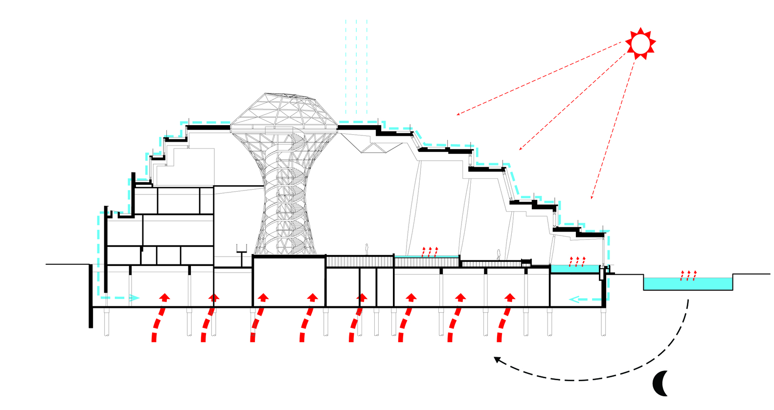 The remarkable ecosystem established by the planted terraces forms an instructive path. The various elements related to environmental sustainability - geothermal energy, water recycling - come together to form a coherent narrative that structures the entire project, and can be read by the public.