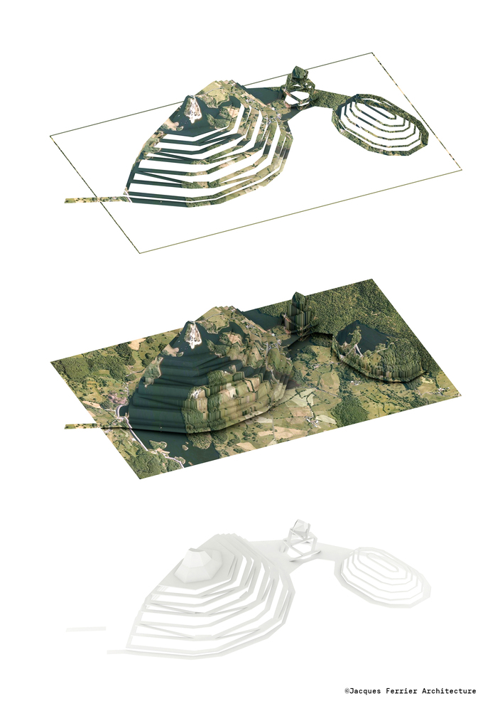 Located by a large expanse of water, the aquatic park looks like a world that has emerged from the lake. It is an aerial construction, layering hanging gardens, playing with water, and transparency. The terraces are open to walkers and are used to oxygenate the waters of the lake.