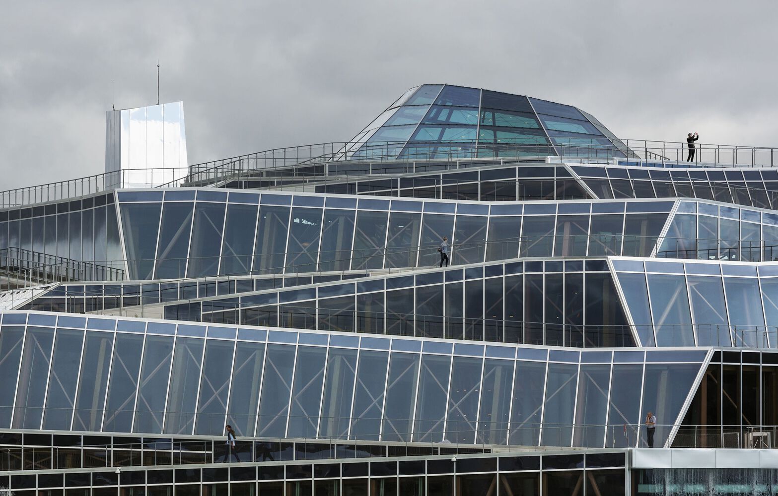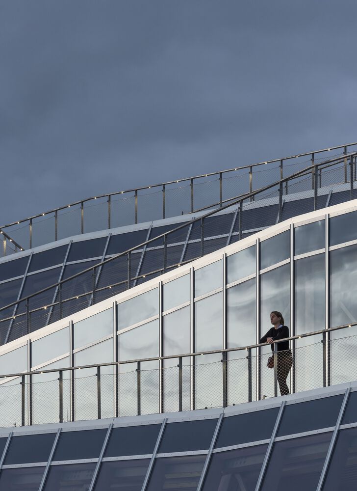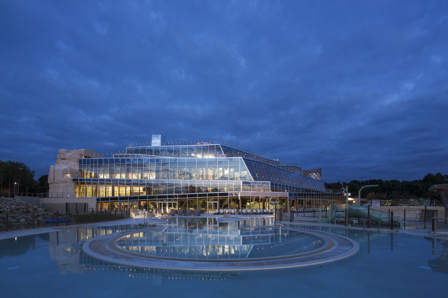 At the top of the building, a transparent dome with a remarkable geometry allows visitors to swim while watching the sky. This dome forms the silhouette of the aquatic park.
