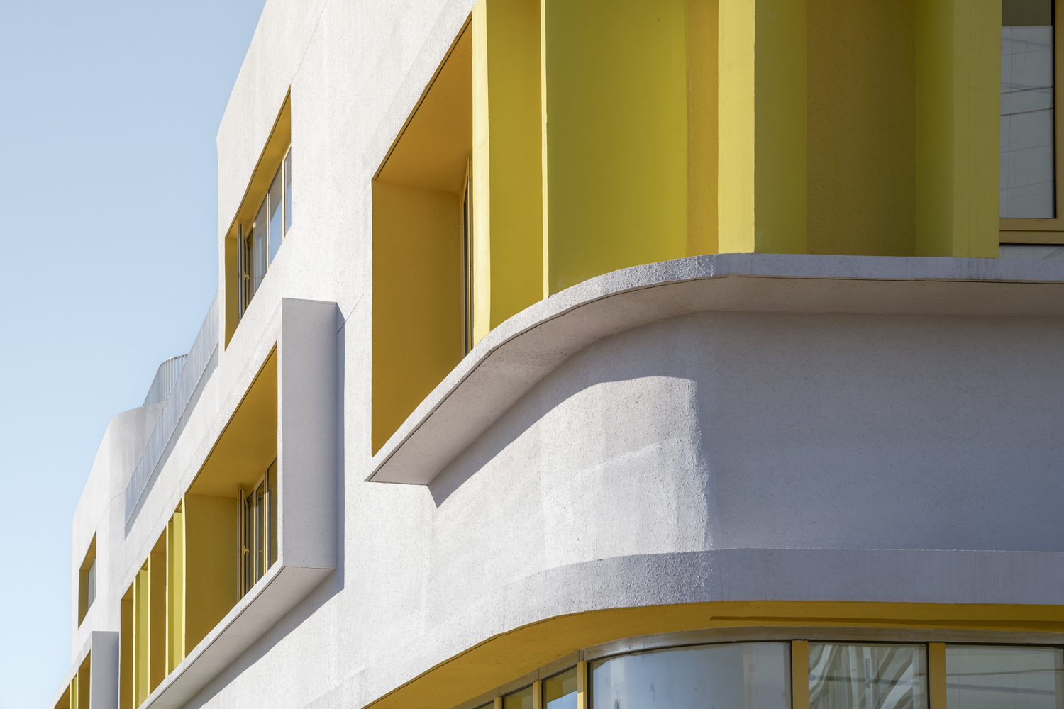 The second-floor facade features raised window frames formed by horizontal and vertical sunshades, adding a layered feel to the building's facade.
