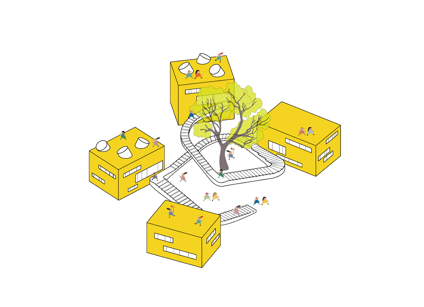 An outdoor staircase clinging to the inner courtyard wall leads children to the second-floor corridor. Passing through a double-height corridor, another spiral staircase takes them to the rooftop, where they climb the slope to the highest rooftop playground.
