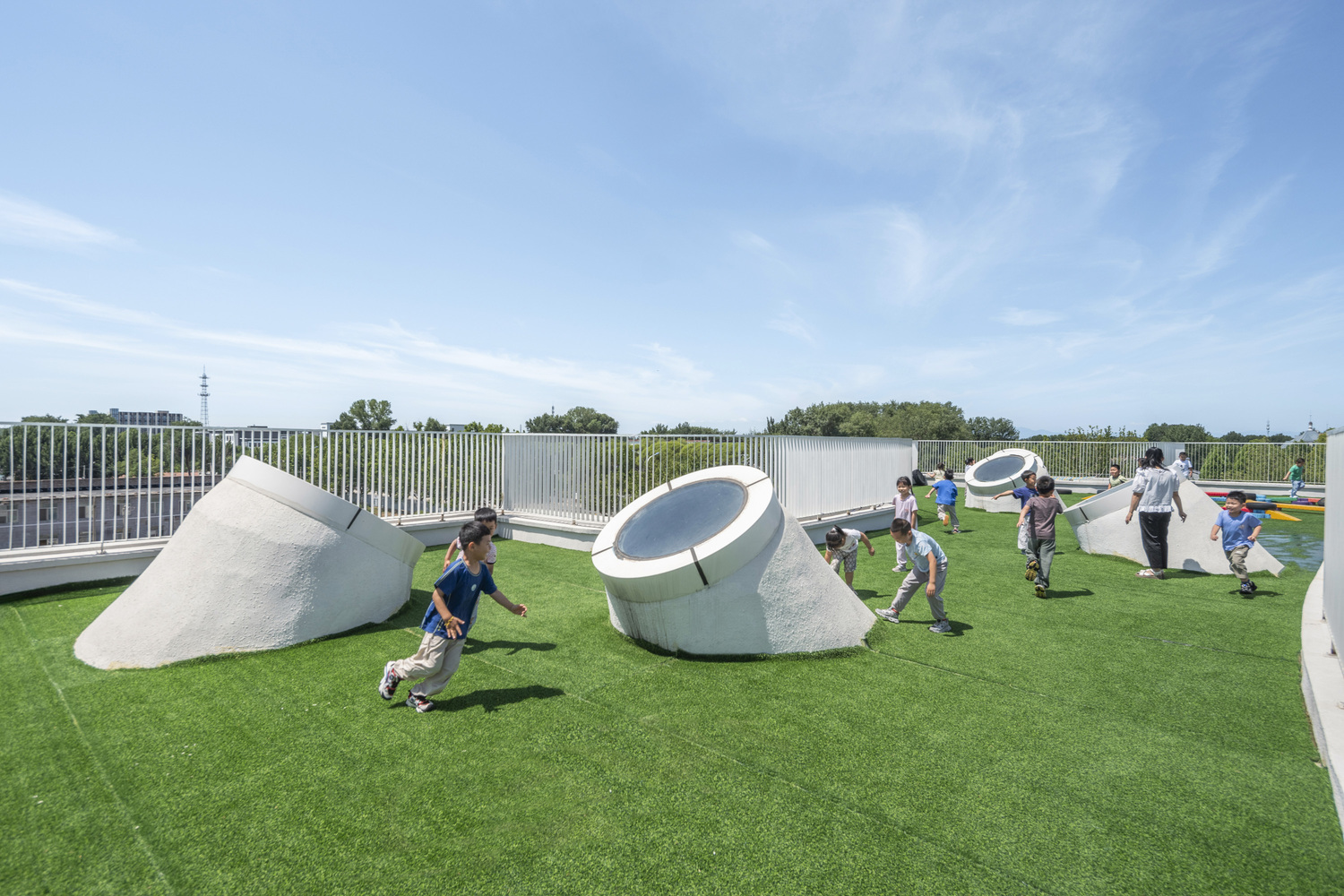 The kindergarten's rooftop is designed as a running playground where children can feel the breeze and gaze at airplanes and distant mountains overhead.