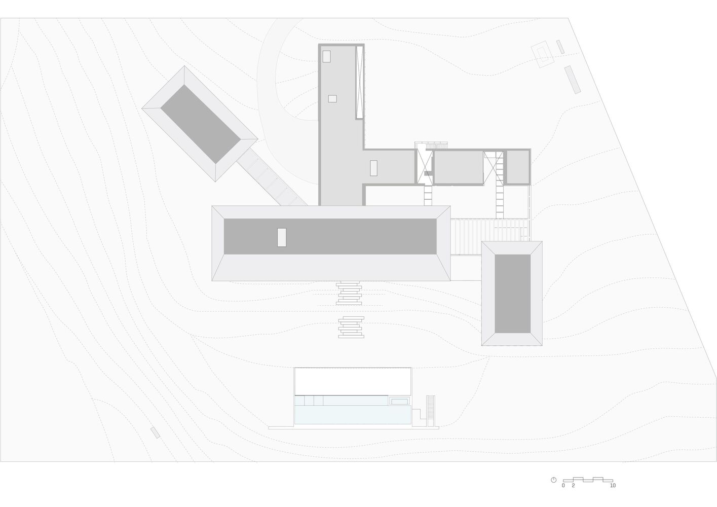 An external landscaped staircase leads down to the pool, for which diDerent height tests were carried out during the project so that its position did not obstruct the view from the house to the lake.