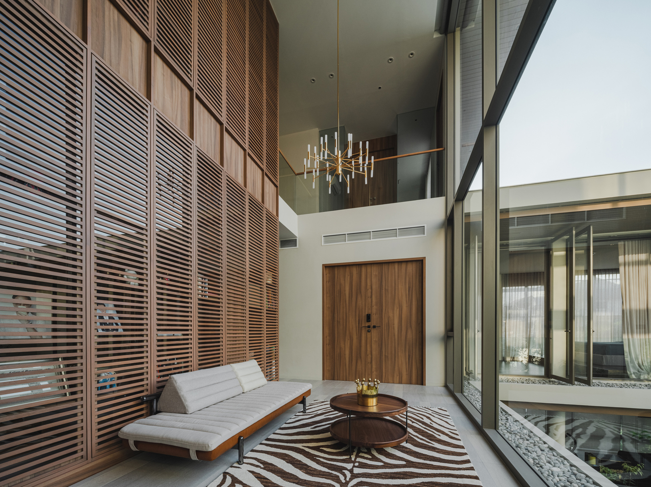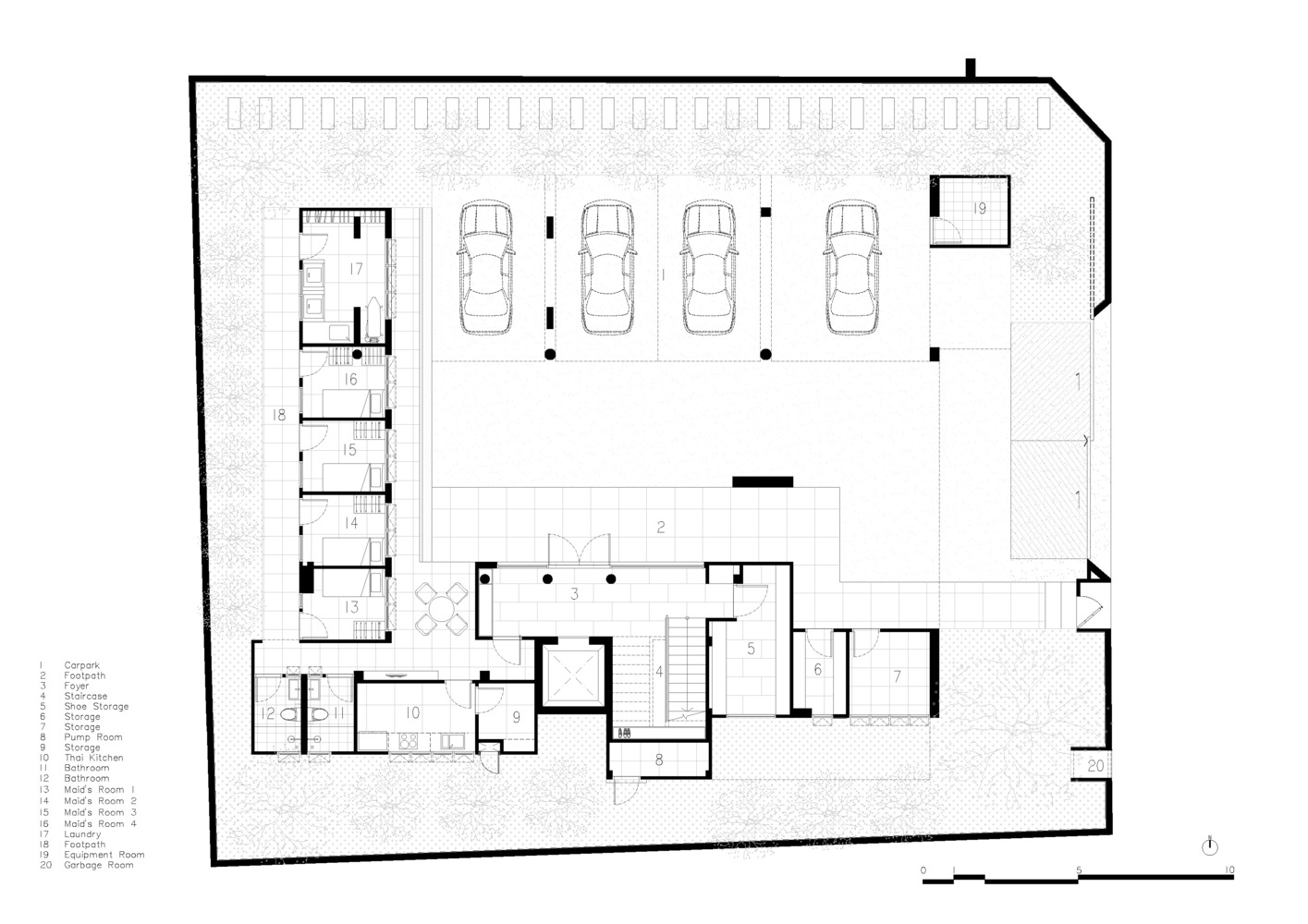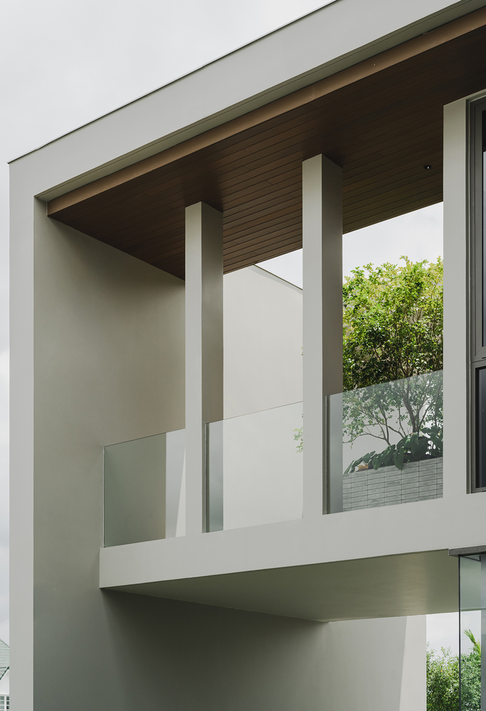 This allocation intends to ensure the efficacy and functional demands for back-of-house facilities such as the shoe storage room, storage room, Thai kitchen, rooms for the four housekeepers, kids' room, room for the entire system work, and a parking space for 6–8 cars. The zoning was realized as a vertical circulation defined by the elevator and stairwell core.