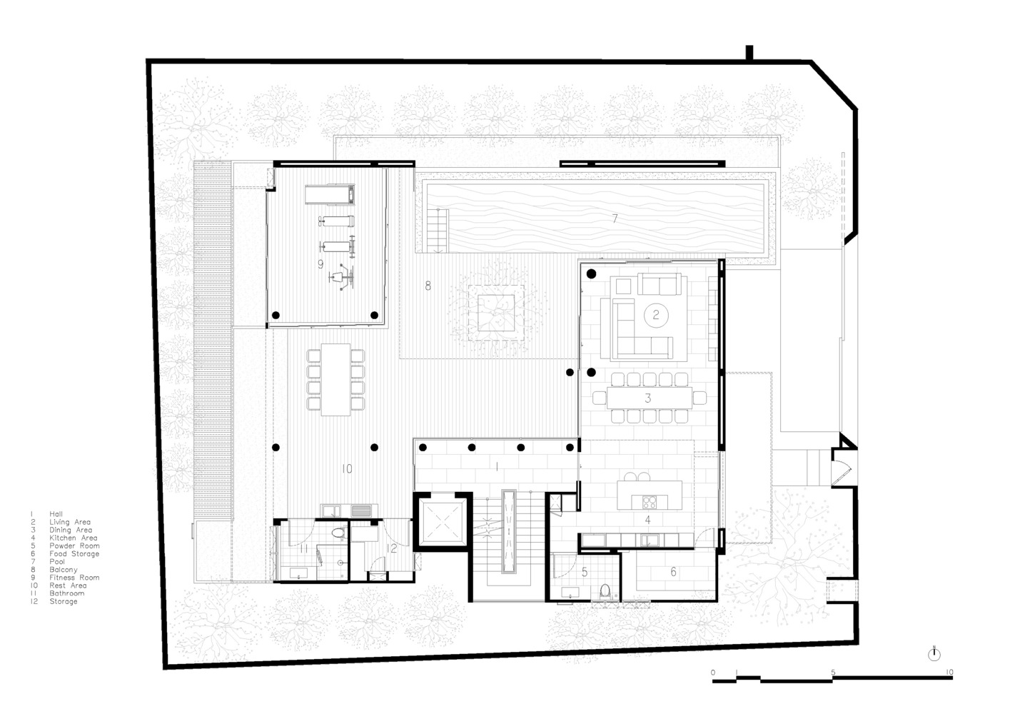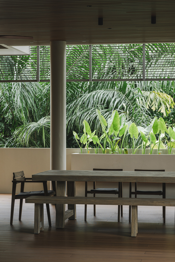 The swimming pool spans virtually the whole length of one side of the house, flanking the living room, fitness room, and outdoor dining area, providing pool view access to almost every area and significantly enhancing natural airflow.