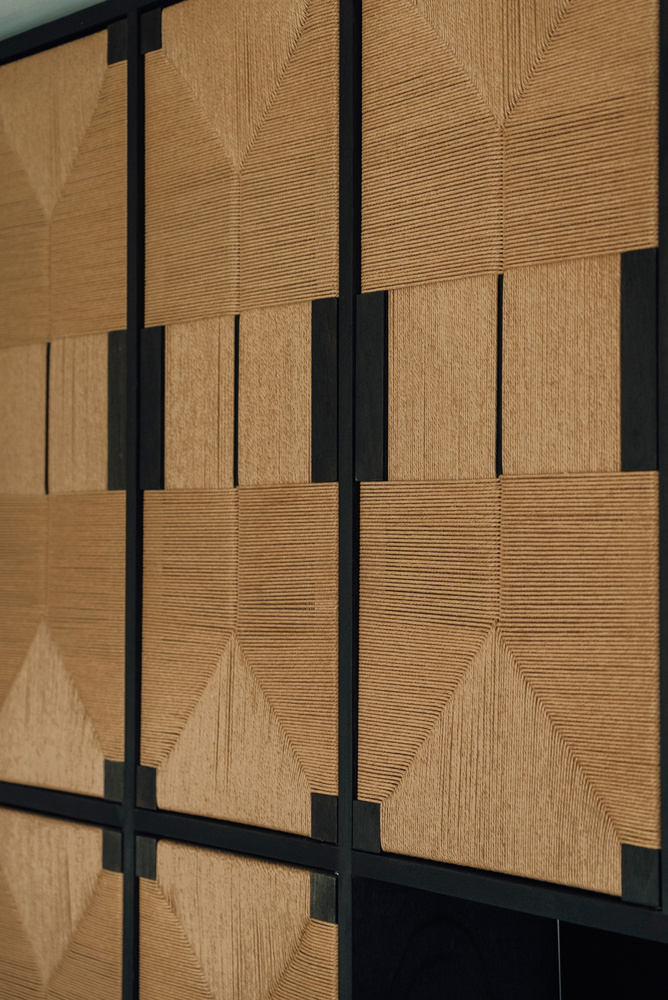 Louvered shutters integrated into the wall allow adjustable control over openings and sightlines, changing the density of light and shadow each day.