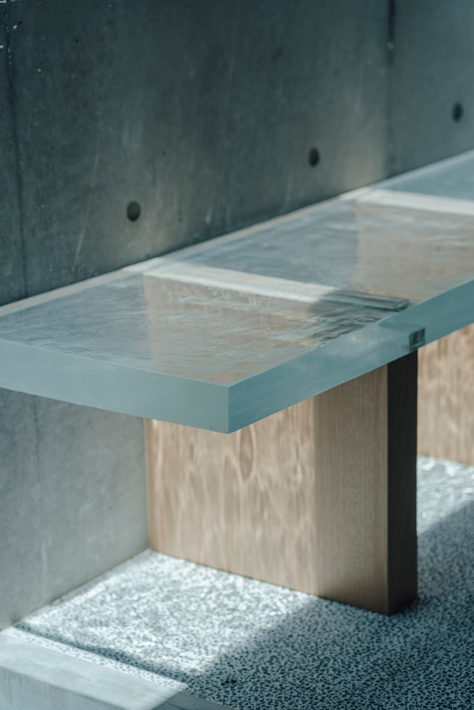 At particular moments, the 65mm-thick acrylic bench at the entrance catches the light from the skylight slit, and the space transforms into a serene sanctuary, gently reminding the inhabitant of the passage of time.